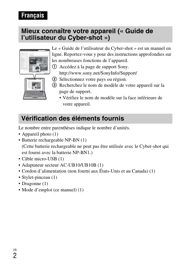Français Mieux connaître votre appareil (« Guide de l’utilisateur du Cyber-shot ») Le « Guide de l’utilisateur du Cyber-shot » est un manuel en ligne. Reportez-vous y pour des instructions approfondies sur les nombreuses fonctions de l’appareil. 1 Accédez à la page de support Sony. http://www.sony.net/SonyInfo/Support/ 2 Sélectionnez votre pays ou région. 3 Recherchez le nom de modèle de votre appareil sur la page de support.