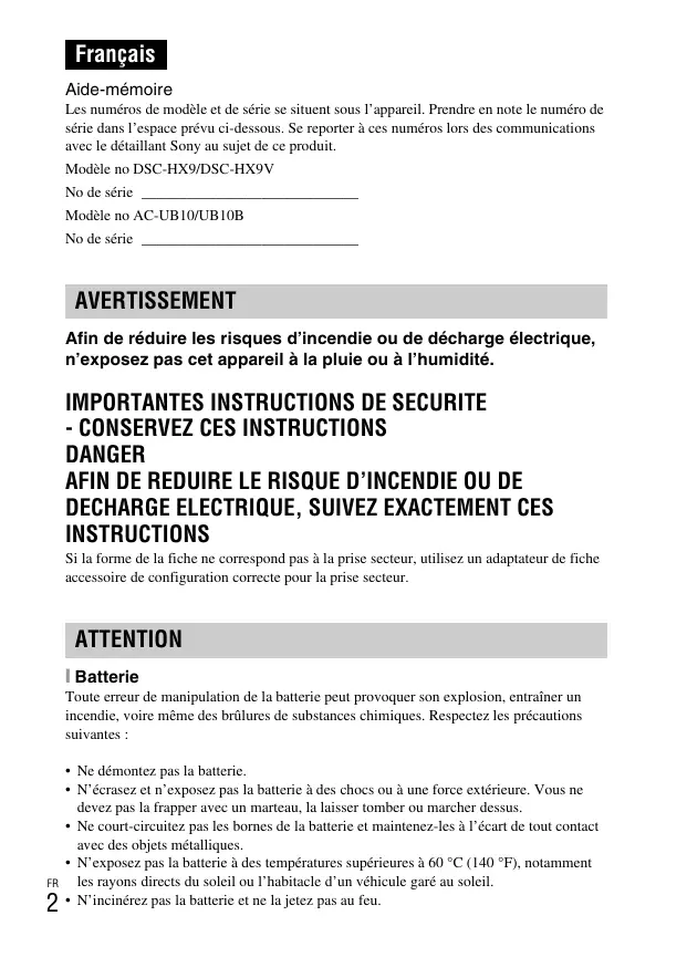: Intelligent Auto : Movie Mode Français Aide-mémoire Les numéros de modèle et de série se situent sous l’appareil. Prendre en note le numéro de série dans l’espace prévu ci-dessous. Se reporter à ces numéros lors des communications avec le détaillant Sony au sujet de ce produit. Modèle no DSC-HX9/DSC-HX9V No de série _____________________________ Modèle no AC-UB10/UB10B No de série _____________________________ AVERTISSEMENT Afin de réduire les risques d’incendie ou de décharge électrique, n’exposez pas cet appareil à la pluie ou à l’humidité.