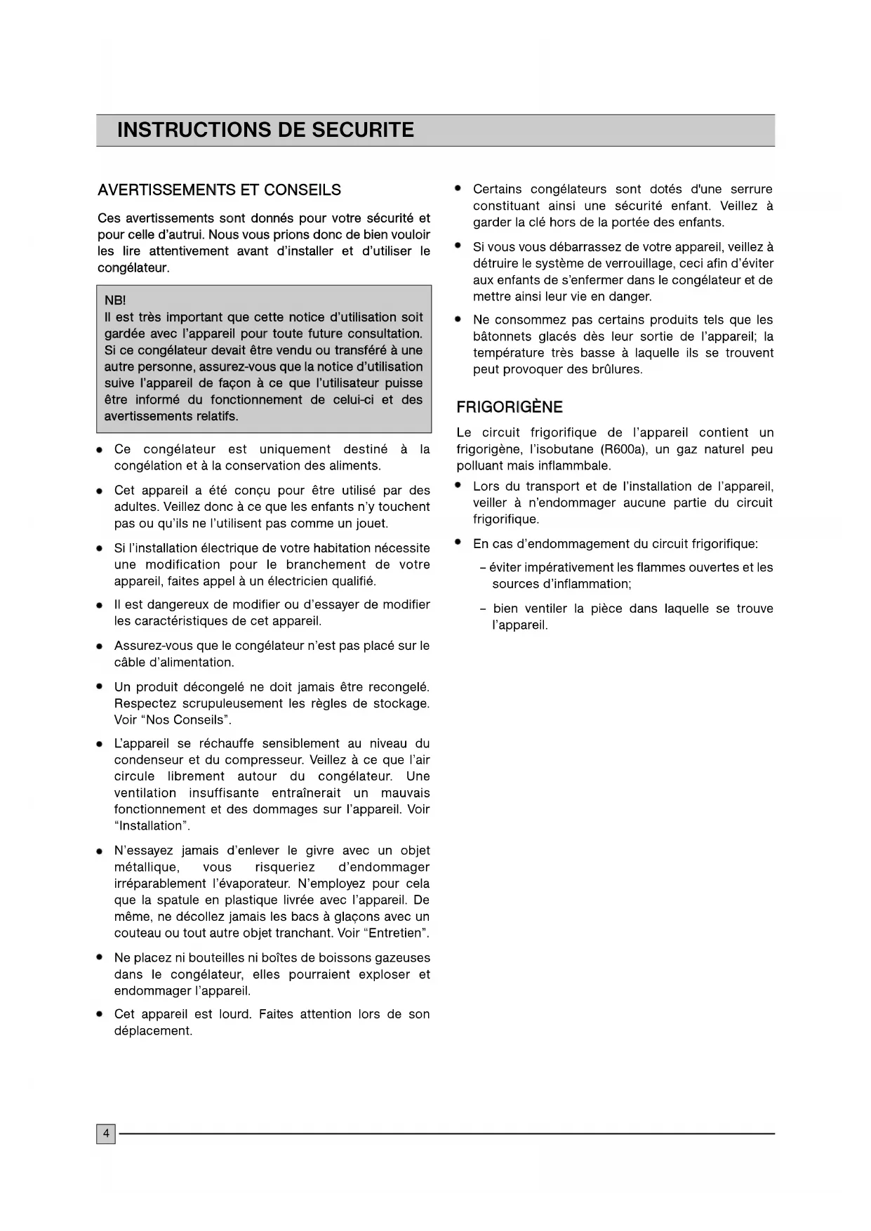 CCeess aavveerrttiisssseemmeennttss ssoonntt ddoonnnnééss ppoouurr vvoottrree ssééccuurriittéé eett ppoouurr cceellllee ddaauuttrruuii.. NNoouuss vvoouuss pprriioonnss ddoonncc ddee bbiieenn vvoouullooiirr lleess lliirree aatttteennttiivveemmeenntt aavvaanntt ddiinnssttaalllleerr eett dduuttiilliisseerr llee ccoonnggééllaatteeuurr.. Ce congélateur est uniquement destiné à la congélation et à la conservation des aliments. Cet appareil a été conçu pour être utilisé par des adultes. Veillez donc à ce que les enfants ny touchent pas ou quils ne lutilisent pas comme un jouet. Si linstallation électrique de votre habitation nécessite une modification pour le branchement de votre appareil, faites appel à un électricien qualifié. Il est dangereux de modifier ou dessayer de modifier les caractéristiques de cet appareil. Assurez-vous que le congélateur nest pas placé sur le câble dalimentation. Un produit décongelé ne doit jamais être recongelé. Respectez scrupuleusement les règles de stockage. Voir Nos Conseils. Lappareil se réchauffe sensiblement au niveau du condenseur et du compresseur. Veillez à ce que lair circule librement autour du congélateur. Une ventilation insuffisante entraînerait un mauvais fonctionnement et des dommages sur lappareil. Voir Installation. Nessayez jamais denlever le givre avec un objet métallique, vous risqueriez dendommager irréparablement lévaporateur. Nemployez pour cela que la spatule en plastique livrée avec lappareil. De même, ne décollez jamais les bacs à glaçons avec un couteau ou tout autre objet tranchant. Voir Entretien. Ne placez ni bouteilles ni boîtes de boissons gazeuses dans le congélateur, elles pourraient exploser et endommager lappareil. Cet appareil est lourd. Faites attention lors de son déplacement. Certains congélateurs sont dotés d'une serrure constituant ainsi une sécurité enfant. Veillez à garder la clé hors de la portée des enfants. Si vous vous débarrassez de votre appareil, veillez à détruire le système de verrouillage, ceci afin déviter aux enfants de senfermer dans le congélateur et de mettre ainsi leur vie en danger. Ne consommez pas certains produits tels que les bâtonnets glacés dès leur sortie de lappareil; la température très basse à laquelle ils se trouvent peut provoquer des brûlures. FFRRIIGGOORRIIGGÈÈNNEE Le circuit frigorifique de lappareil contient un frigorigène, lisobutane (R600a), un gaz naturel peu polluant mais inflammbale. Lors du transport et de linstallation de lappareil, veiller à nendommager aucune partie du circuit frigorifique. En cas dendommagement du circuit frigorifique: éviter impérativement les flammes ouvertes et les sources dinflammation; bien ventiler la pièce dans laquelle se trouve lappareil.