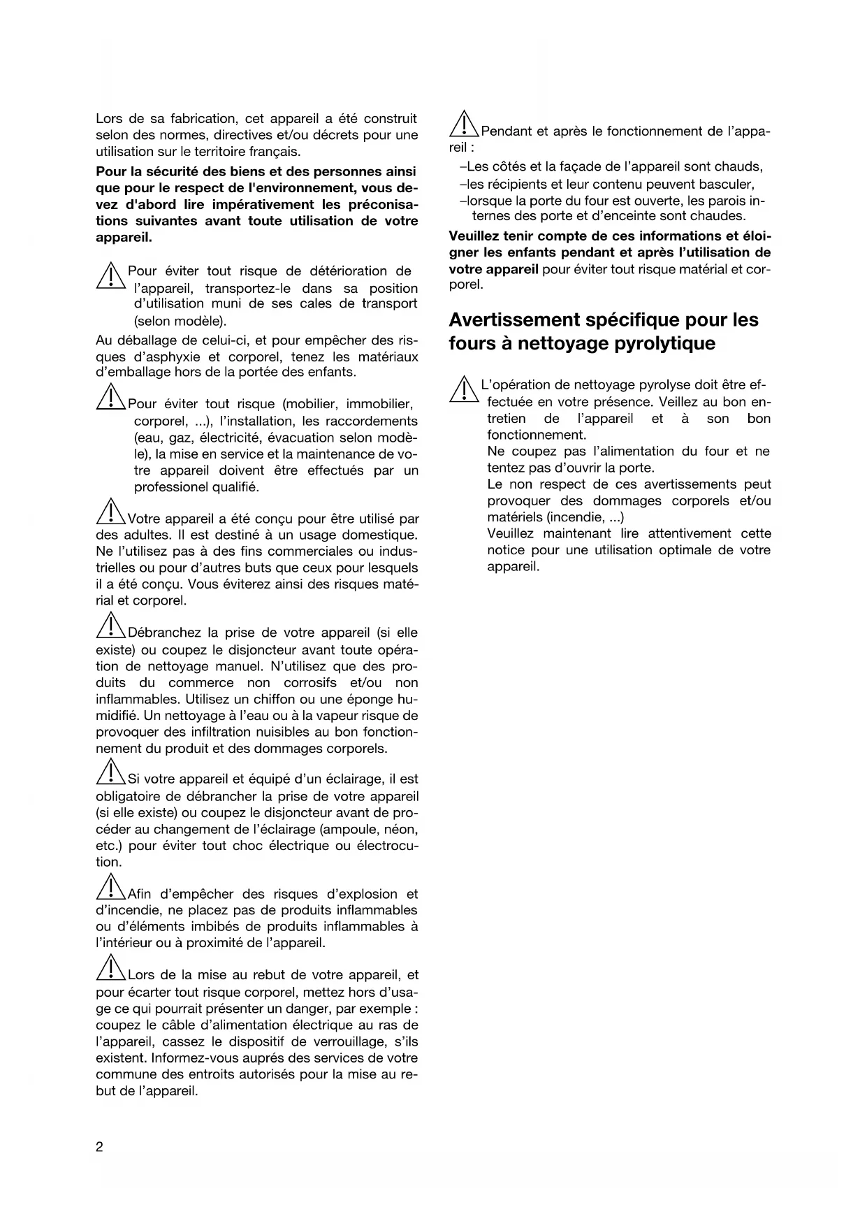 - ) Veuillez maintenant lire attentivement cette notice pour une utilisation optimale de votre appareil.3 Chère cliente, cher client, Veuillez lire attentivement la notice d’utilisation dans son intégralité et la conserver pour pouvoir le consul- ter ultérieurement. Veuillez la transmettre à l’éventuel propriétaire ulté- rieur de l’appareil. Les symboles suivants sont utilisés dans ce document : 1 Consignes de sécurité Avertissement ! Conseils pour votre sécurité personnelle. Avertissement ! Consignes permettant d’évi- ter d’endommager l’appareil. 3 Conseils généraux et pratiques 2 Informations environnementales4 Sommaire Avertissement spécifique pour les fours à nettoyage pyrolytique p. 2