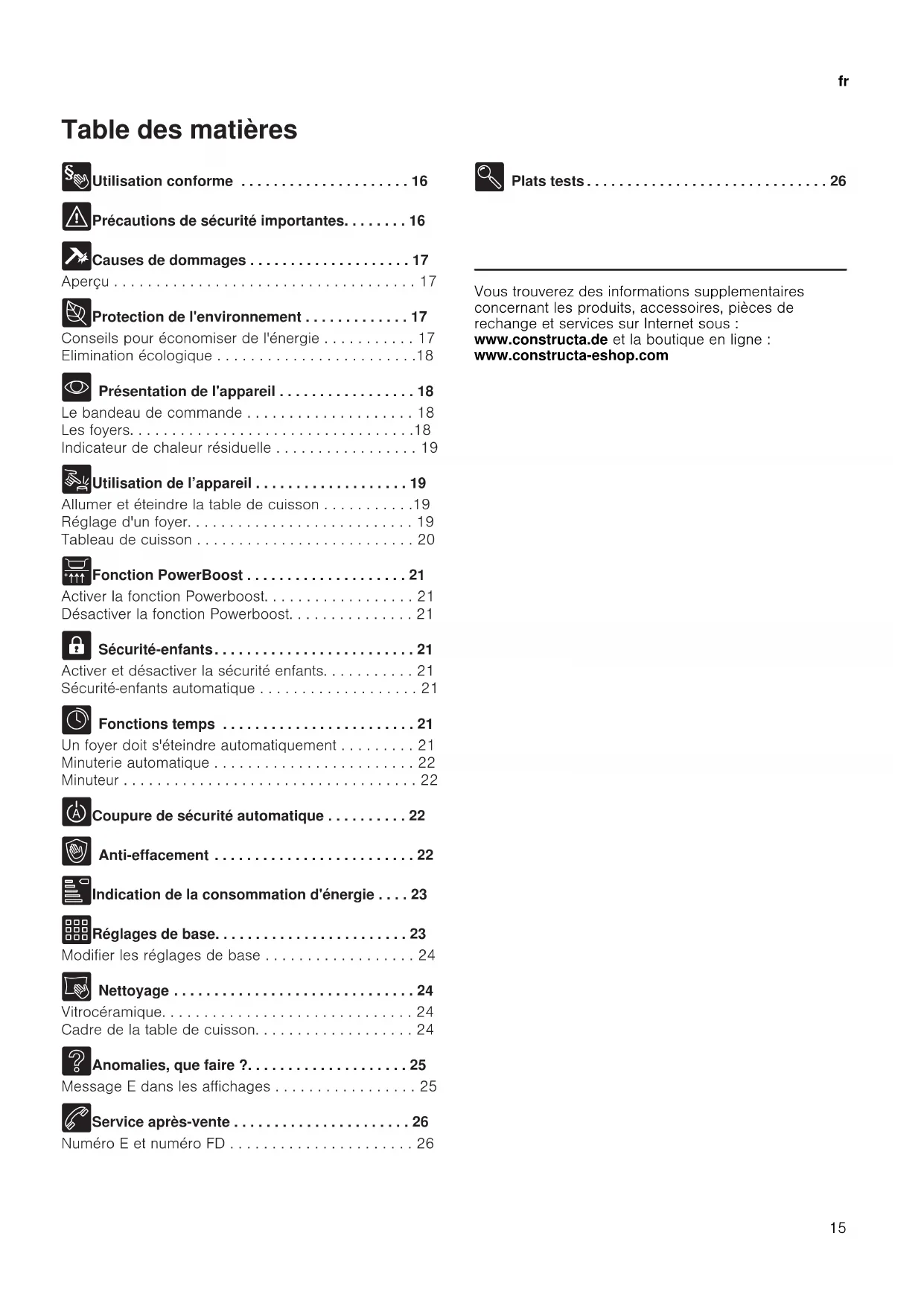 - Présentation de l'appareil . . . . . . . . . . . . . . . . . 18 Le bandeau de commande . . . . . . . . . . . . . . . . . . . . 18 Les foyers. . . . . . . . . . . . . . . . . . . . . . . . . . . . . . . . . .18 Indicateur de chaleur résiduelle . . . . . . . . . . . . . . . . . 19 1 Utilisation de l’appareil . . . . . . . . . . . . . . . . . . . 19 Allumer et éteindre la table de cuisson . . . . . . . . . . .19 Réglage d'un foyer. . . . . . . . . . . . . . . . . . . . . . . . . . . 19 Tableau de cuisson . . . . . . . . . . . . . . . . . . . . . . . . . . 20 v Fonction PowerBoost . . . . . . . . . . . . . . . . . . . . 21 Activer la fonction Powerboost. . . . . . . . . . . . . . . . . . 21 Désactiver la fonction Powerboost. . . . . . . . . . . . . . . 21 A Sécurité-enfants. . . . . . . . . . . . . . . . . . . . . . . . . 21 Activer et désactiver la sécurité enfants. . . . . . . . . . . 21 Sécuritéenfants automatique . . . . . . . . . . . . . . . . . . . 21 O Fonctions temps . . . . . . . . . . . . . . . . . . . . . . . . 21 Un foyer doit s'éteindre automatiquement . . . . . . . . . 21 Minuterie automatique . . . . . . . . . . . . . . . . . . . . . . . . 22 Minuteur . . . . . . . . . . . . . . . . . . . . . . . . . . . . . . . . . . . 22 b Coupure de sécurité automatique . . . . . . . . . . 22 k Anti-effacement . . . . . . . . . . . . . . . . . . . . . . . . . 22 [ Indication de la consommation d'énergie . . . . 23 Q Réglages de base. . . . . . . . . . . . . . . . . . . . . . . . 23 Modifier les réglages de base . . . . . . . . . . . . . . . . . . 24 D Nettoyage . . . . . . . . . . . . . . . . . . . . . . . . . . . . . . 24 Vitrocéramique. . . . . . . . . . . . . . . . . . . . . . . . . . . . . . 24 Cadre de la table de cuisson. . . . . . . . . . . . . . . . . . . 24 3 Anomalies, que faire ?. . . . . . . . . . . . . . . . . . . . 25 Message E dans les affichages . . . . . . . . . . . . . . . . . 25 4 Service après-vente . . . . . . . . . . . . . . . . . . . . . . 26 Numéro E et numéro FD . . . . . . . . . . . . . . . . . . . . . . 26 E Plats tests . . . . . . . . . . . . . . . . . . . . . . . . . . . . . . 26 Produktinfo Vous trouverez des informations supplementaires concernant les produits, accessoires, pièces de rechange et services sur Internet sous : www.constructa.de et la boutique en ligne : www.constructa-eshop.comfr Utilisation conforme