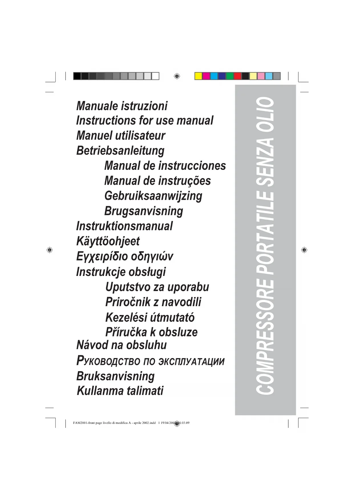Pag 4-5-EN.indd 3 19/04/2002, 10.21.44Ne pas diriger le jet d’air vers des personnes, des animaux ou soi-même. Porter des lunettes spécifi ques pour proté- ger les yeux contre les corps étrangers sou- levés par le jet. Ne jamais diriger le jet de liquides pulvérisés par des outils connectés au compresseur vers celui-ci. Ne pas utiliser le compresseur, pieds nus ou les mains/pieds mouillés. Ne pas tirer le câble d’alimentation pour débrancher la fi che de la prise ou pour déplacer le compresseur. Ne pas laisser le compresseur exposé aux agents atmosphériques (pluie, soleil, brouillard, neige). Interdire l’utilisation du compresseur à des personnes inexpérimentées. Eloigner les enfants et les animaux de la zone de travail. Ne pas nettoyer le compresseur à l’aide de liquides infl ammables ou de solvants. Utiliser uniquement un chiffon humide, après avoir vérifi é la déconnexion de la prise électrique. Le compresseur doit être utilisé dans des locaux appropriés (bien ventilés, avec une température ambiante comprise entre +5°C et +40°C), exempts de poussière, d’acides, de vapeurs, de gaz explosifs ou infl ammables. Ne pas placer d’objets infl ammables ou en nylon/tissu à proximité et/ou sur le compresseur. Toujours respecter une distance de sécurité d’au moins 3 mètres entre le compresseur et la zone de travail. Introduire la fi che du câble électrique dans une prise adéquate en termes de forme, de tension et de fréquence ainsi que conforme aux normes en vigueur. Utiliser des rallonges du câble électrique d’une longueur maximum de 5 mètres et avec une section non inférieure à 1,5 mm2. Il est déconseillé d’utiliser des rallonges d’une longueur et d’une section différentes ainsi que des adaptateurs et des prises multiples. Utiliser exclusivement la poignée pour
