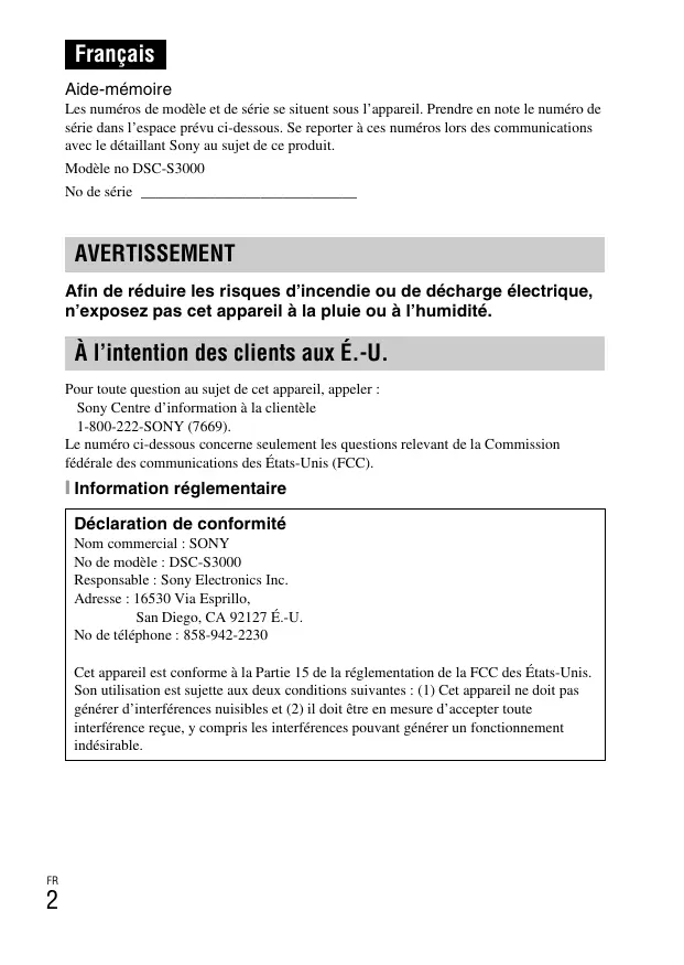 Français Aide-mémoire Les numéros de modèle et de série se situent sous l’appareil. Prendre en note le numéro de série dans l’espace prévu ci-dessous. Se reporter à ces numéros lors des communications avec le détaillant Sony au sujet de ce produit. Modèle no DSC-S3000 No de série _____________________________ AVERTISSEMENT Afin de réduire les risques d’incendie ou de décharge électrique, n’exposez pas cet appareil à la pluie ou à l’humidité. À l’intention des clients aux É.-U. Pour toute question au sujet de cet appareil, appeler : Sony Centre d’information à la clientèle 1-800-222-SONY (7669). Le numéro ci-dessous concerne seulement les questions relevant de la Commission fédérale des communications des États-Unis (FCC). [ Information réglementaire Déclaration de conformité Nom commercial : SONY No de modèle : DSC-S3000 Responsable : Sony Electronics Inc. Adresse : 16530 Via Esprillo, San Diego, CA 92127 É.-U. No de téléphone : 858-942-2230 Cet appareil est conforme à la Partie 15 de la réglementation de la FCC des États-Unis. Son utilisation est sujette aux deux conditions suivantes : (1) Cet appareil ne doit pas générer d’interférences nuisibles et (2) il doit être en mesure d’accepter toute interférence reçue, y compris les interférences pouvant générer un fonctionnement indésirable.