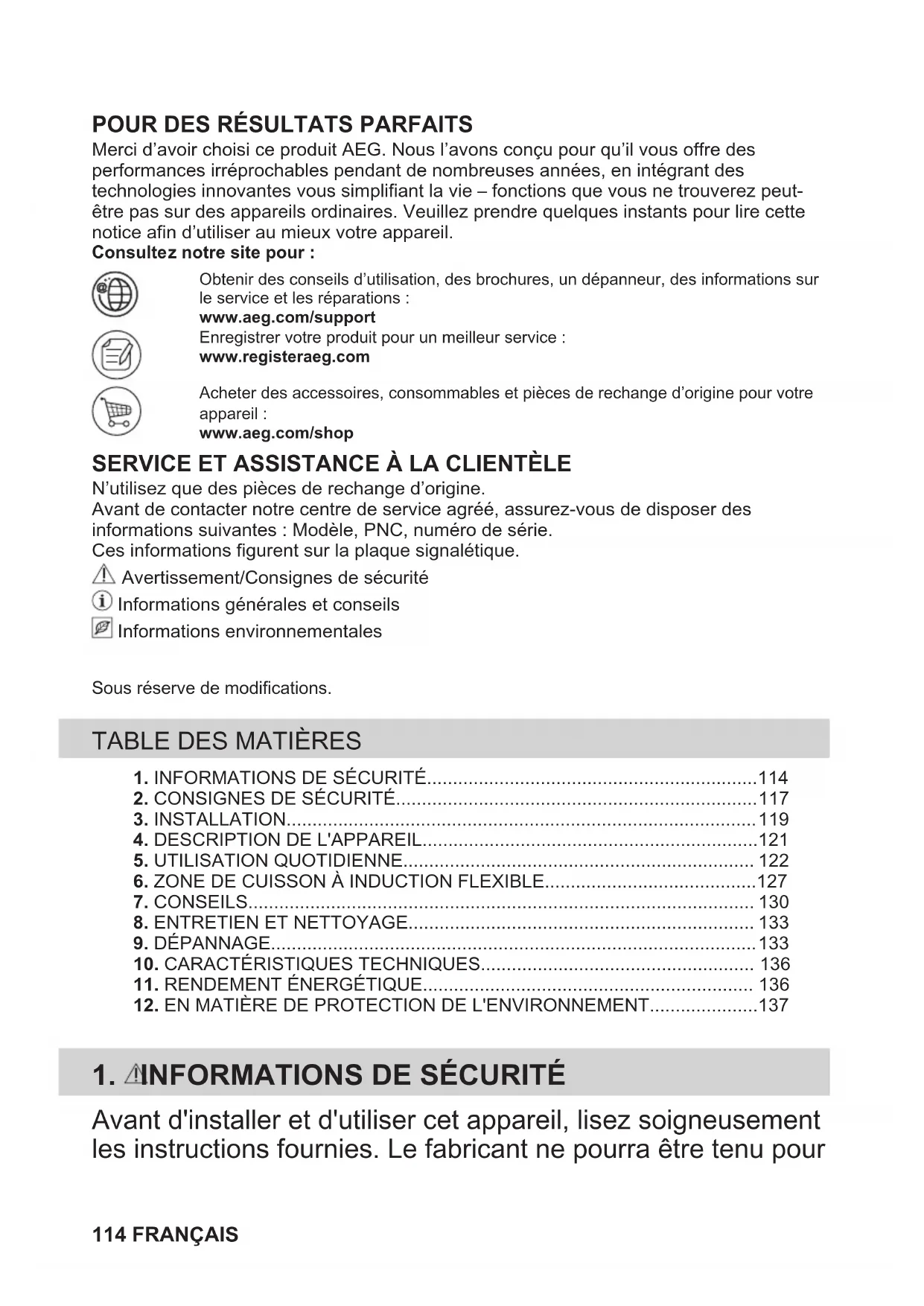 N’utilisez que des pièces de rechange d’origine.Avant de contacter notre centre de service agréé, assurez-vous de disposer desinformations suivantes : Modèle, PNC, numéro de série.Ces informations figurent sur la plaque signalétique. Avertissement/Consignes de sécurité Informations générales et conseils Informations environnementalesSous réserve de modifications.