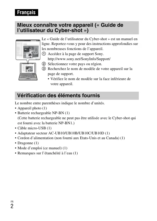 Français Mieux connaître votre appareil (« Guide de l’utilisateur du Cyber-shot ») Le « Guide de l’utilisateur du Cyber-shot » est un manuel en ligne. Reportez-vous y pour des instructions approfondies sur les nombreuses fonctions de l’appareil. 1 Accédez à la page de support Sony. http://www.sony.net/SonyInfo/Support/ 2 Sélectionnez votre pays ou région. 3 Recherchez le nom de modèle de votre appareil sur la page de support.