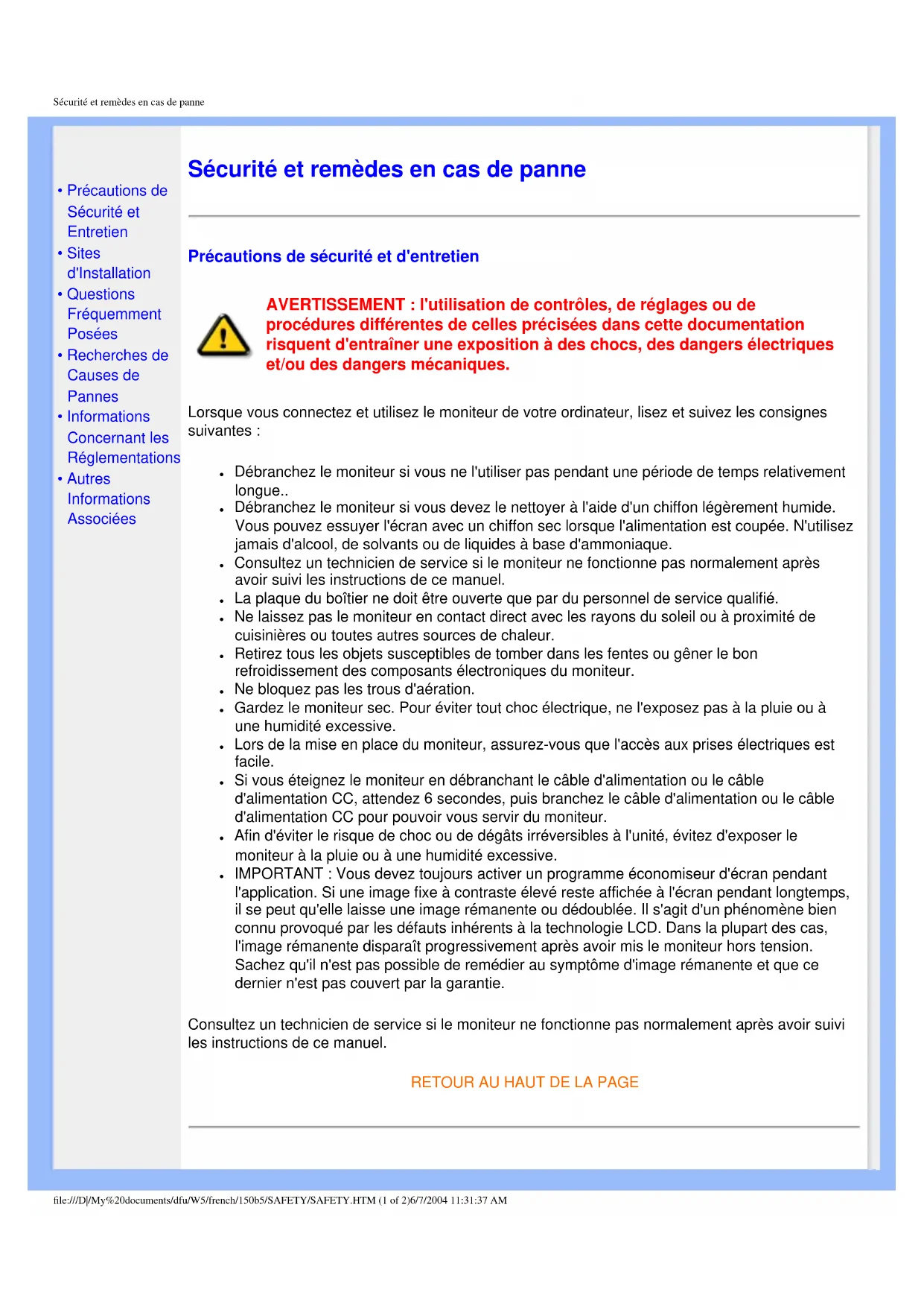 file:///D|/My%20documents/dfu/W5/french/150b5/SAFETY/SAFETY.HTM (1 of 2)6/7/2004 11:31:37 AMSécurité et remèdes en cas de panne Sites d'installation ● évitez la chaleur et le froid intense ● Ne rangez pas et n'utilisez pas le moniteur LCD à des endroits exposés à la chaleur, aux rayons directs du soleil ou à un froid intense ● évitez de déplacer le moniteur LCD entre des endroits où les différences de température sont importantes. Choisissez un site tombant dans les intervalles de température et d'humidité suivants : ❍ Température: 5-40°C 41-104°F ❍ Humidité: 20-80% RH ● Ne soumettez pas le moniteur LCD à de grosses vibrations ou à des chocs élevés. Ne placez pas le moniteur LCD dans le coffre d'une voiture. ● Veillez à ne pas abîmer ce produit en le cognant ou en le faisant tomber lors de son fonctionnement ou de son transport. ● Ne rangez pas et n'utilisez pas le moniteur LCD à des endroits exposés à un degré élevé d'humidité ou un environnement poussiéreux. Veillez aussi à ne pas renverser de l'eau ou d'autres liquides sur ou à l'intérieur du moniteur LCD.