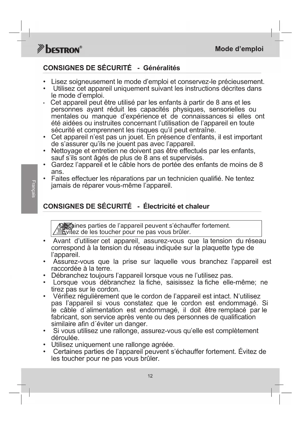 10. Pour pouvoir faire appel à la garantie, vous pouvez vous adresser à votre revendeur. Bestron offre aussi