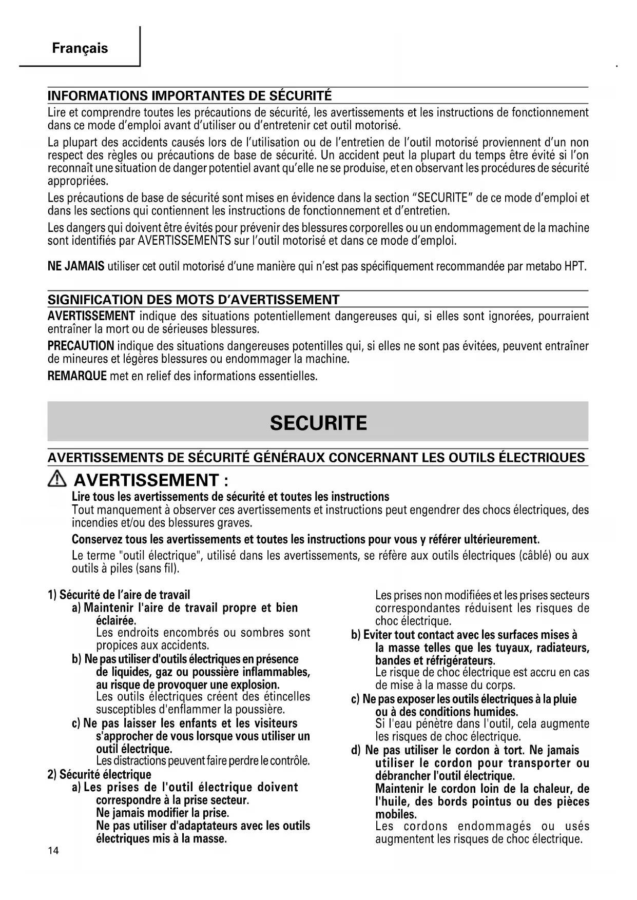 Lire et comprendre toutes les précautions de sécurité, les avertissements et les instructions de fonctionnement dans ce mode d’emploi avant d’utiliser ou d’entretenir cet outil motorisé. La plupart des accidents causés lors de l’utilisation ou de l’entretien de l’outil motorisé proviennent d’un non respect des règles ou précautions de base de sécurité. Un accident peut la plupart du temps être évité si l’on reconnaît une situation de danger potentiel avant qu’elle ne se produise, et en observant les procédures de sécurité appropriées. Les précautions de base de sécurité sont mises en évidence dans la section “SECURITE” de ce mode d’emploi et dans les sections qui contiennent les instructions de fonctionnement et d’entretien. Les dangers qui doivent être évités pour prévenir des blessures corporelles ou un endommagement de la machine sont identifiés par AVERTISSEMENTS sur l’outil motorisé et dans ce mode d’emploi. NE JAMAIS utiliser cet outil motorisé d’une manière qui n’est pas spécifiquement recommandée par metabo HPT.