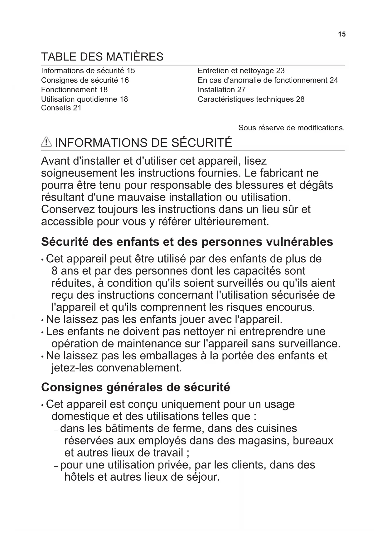 Informations de sécurité 15 Consignes de sécurité 16 Fonctionnement 18 Utilisation quotidienne 18 Conseils 21 Entretien et nettoyage 23 En cas d'anomalie de fonctionnement 24 Installation 27 Caractéristiques techniques 28 Sous réserve de modifications.