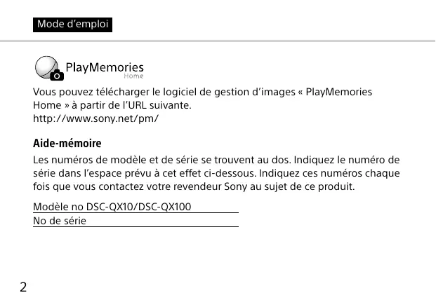 Vous pouvez télécharger le logiciel de gestion d’images « PlayMemories Home » à partir de l’URL suivante. http://www.sony.net/pm/ Aide-mémoire Les numéros de modèle et de série se trouvent au dos. Indiquez le numéro de série dans l’espace prévu à cet effet ci-dessous. Indiquez ces numéros chaque fois que vous contactez votre revendeur Sony au sujet de ce produit. Modèle no DSC-QX10/DSC-QX100 No de série