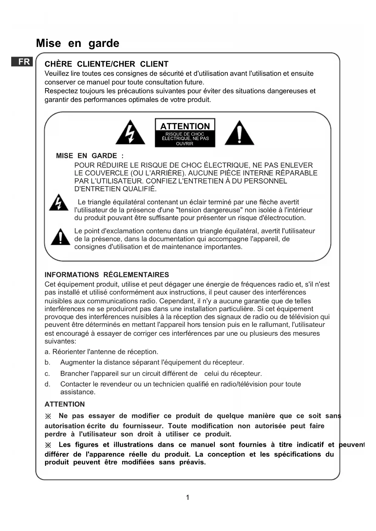 Cet équipement produit, utilise et peut dégager une énergie de fréquences radio et, s'il n'est pas installé et utilisé conformément aux instructions, il peut causer des interférences nuisibles aux communications radio. Cependant, il n'y a aucune garantie que de telles interférences ne se produiront pas dans une installation particulière. Si cet équipement provoque des interférences nuisibles à la réception des signaux de radio ou de télévision qui peuvent être déterminés en mettant l'appareil hors tension puis en le rallumant, l'utilisateur est encouragé à essayer de corriger ces interférences par une ou plusieurs des mesures suivantes: a. Réorienter l'antenne de réception. b. Augmenter la distance séparant l'équipement du récepteur. c. Brancher l'appareil sur un circuit différent de celui du récepteur. d. Contacter le revendeur ou un technicien qualifié en radio/télévision pour toute assistance. ATTENTION ※ Ne pas essayer de modifier ce produit de quelque manière que ce soit sans autorisation écrite du fournisseur. Toute modification non autorisée peut faire perdre à l'utilisateur son droit à utiliser ce produit. ※ Les figures et illustrations dans ce manuel sont fournies à titre indicatif et peuvent différer de l'apparence réelle du produit. La conception et les spécifications du produit peuvent être modifiées sans préavis. MISE EN GARDE : POUR RÉDUIRE LE RISQUE DE CHOC ÉLECTRIQUE, NE PAS ENLEVER LE COUVERCLE (OU L’ARRIÈRE). AUCUNE PIÈCE INTERNE RÉPARABLE PAR L’UTILISATEUR. CONFIEZ L'ENTRETIEN À DU PERSONNEL D'ENTRETIEN QUALIFIÉ. Le triangle équilatéral contenant un éclair terminé par une flèche avertit l'utilisateur de la présence d'une "tension dangereuse" non isolée à l'intérieur du produit pouvant être suffisante pour présenter un risque d'électrocution. Le point d'exclamation contenu dans un triangle équilatéral, avertit l'utilisateur de la présence, dans la documentation qui accompagne l'appareil, de consignes d'utilisation et de maintenance importantes. ATTENTION