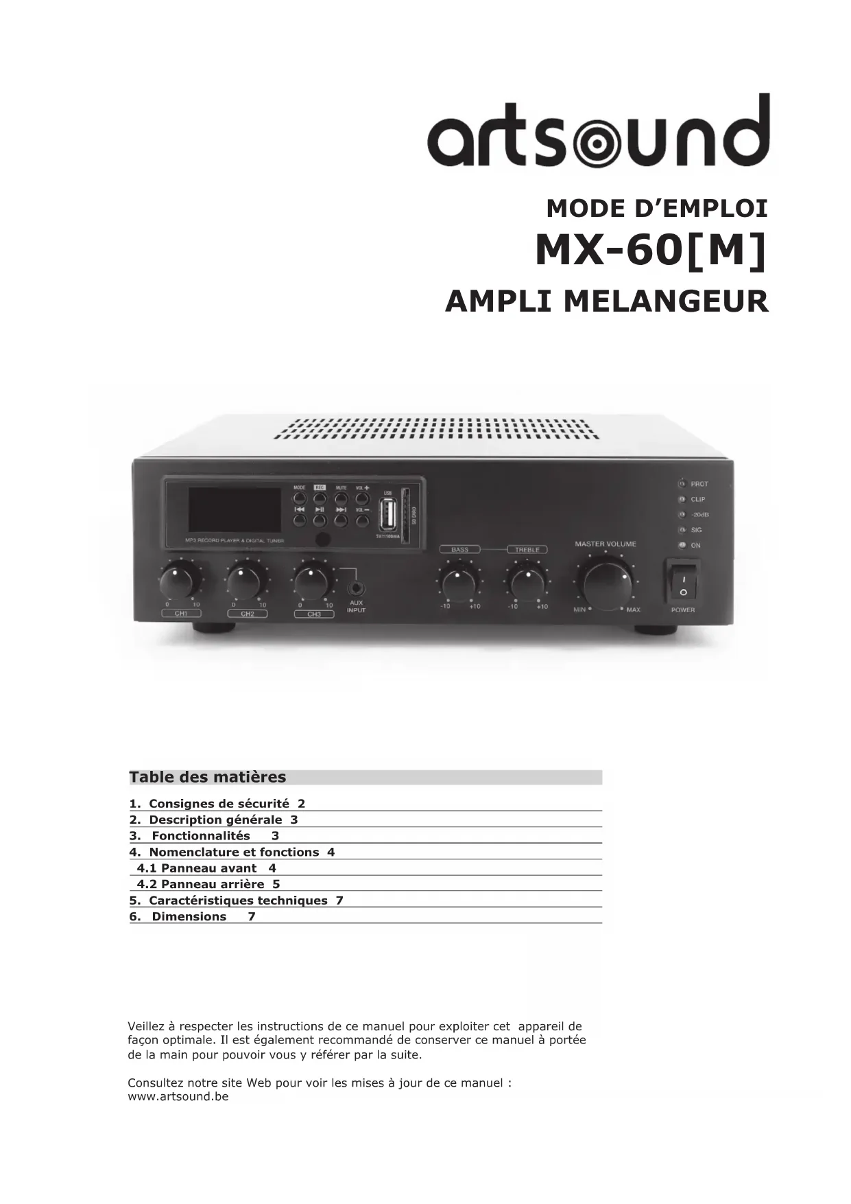 MX-60[M] AMPLI MELANGEUR Veillez à respecter les instructions de ce manuel pour exploiter cet appareil de façon optimale. Il est également recommandé de conserver ce manuel à portée de la main pour pouvoir vous y référer par la suite. Consultez notre site Web pour voir les mises à jour de ce manuel : www.artsound.be Table des matières