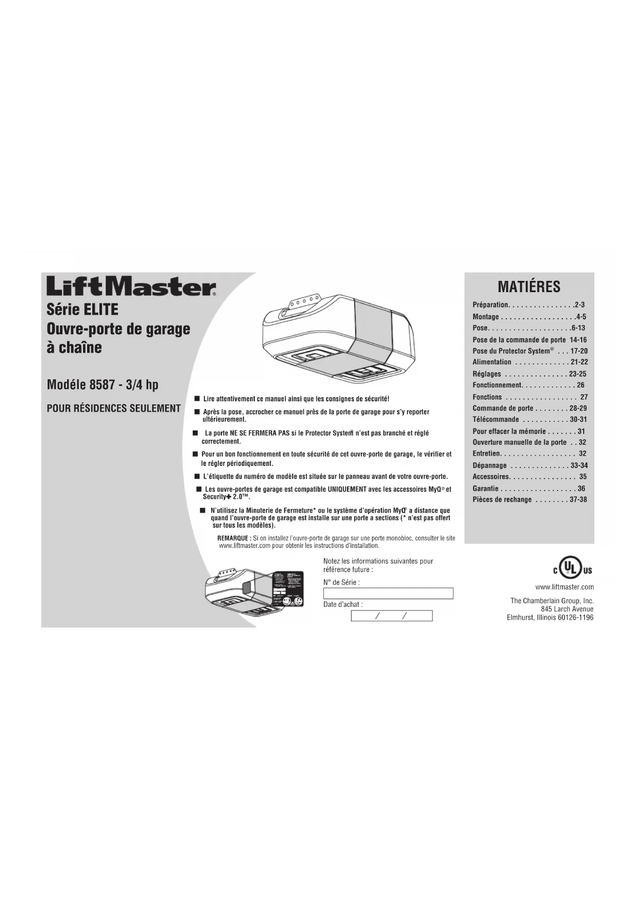 - Pièces de rechange -38 Série ELITE Ouvre-porte de garage à chaîne The Chamberlain Group, Inc.845 Larch AvenueElmhurst, Illinois 60126-1196 Lire attentivement ce manuel ainsi que les consignes de sécurité!■ Après la pose, accrocher ce manuel près de la porte de garage pour s’y reporter ultérieurement.■ La porte NE SE FERMERA PAS si le Protector System n’est pas branché et réglé correctement. ■ Pour un bon fonctionnement en toute sécurité de cet ouvre-porte de garage, le vérifier et le régler périodiquement.■ L’étiquette du numéro de modèle est située sur le panneau avant de votre ouvre-porte.■ Les ouvre-portes de garage est compatible UNIQUEMENT avec les accessoires MyQ p. 37