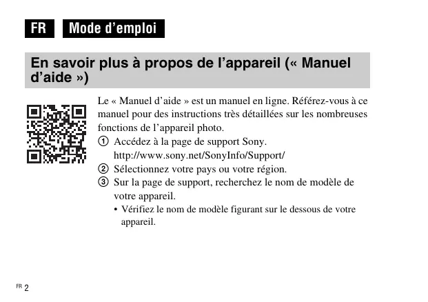 En savoir plus à propos de l’appareil (« Manuel d’aide ») Le « Manuel d’aide » est un manuel en ligne. Référez-vous à ce manuel pour des instructions très détaillées sur les nombreuses fonctions de l’appareil photo. 1 Accédez à la page de support Sony. http://www.sony.net/SonyInfo/Support/ 2 Sélectionnez votre pays ou votre région. 3 Sur la page de support, recherchez le nom de modèle de votre appareil.