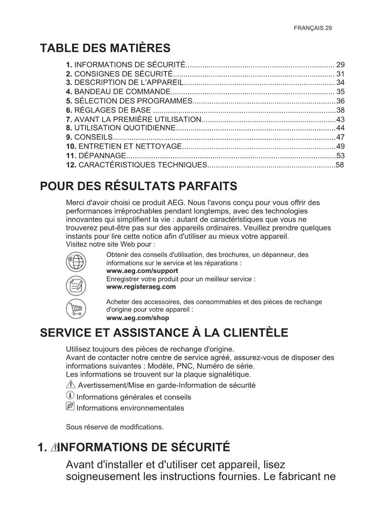 Merci d'avoir choisi ce produit AEG. Nous l'avons conçu pour vous offrir des performances irréprochables pendant longtemps, avec des technologies innovantes qui simplifient la vie : autant de caractéristiques que vous ne trouverez peut-être pas sur des appareils ordinaires. Veuillez prendre quelques instants pour lire cette notice afin d'utiliser au mieux votre appareil. Visitez notre site Web pour : Obtenir des conseils d'utilisation, des brochures, un dépanneur, des informations sur le service et les réparations : www.aeg.com/support Enregistrer votre produit pour un meilleur service : www.registeraeg.com Acheter des accessoires, des consommables et des pièces de rechange d'origine pour votre appareil : www.aeg.com/shop