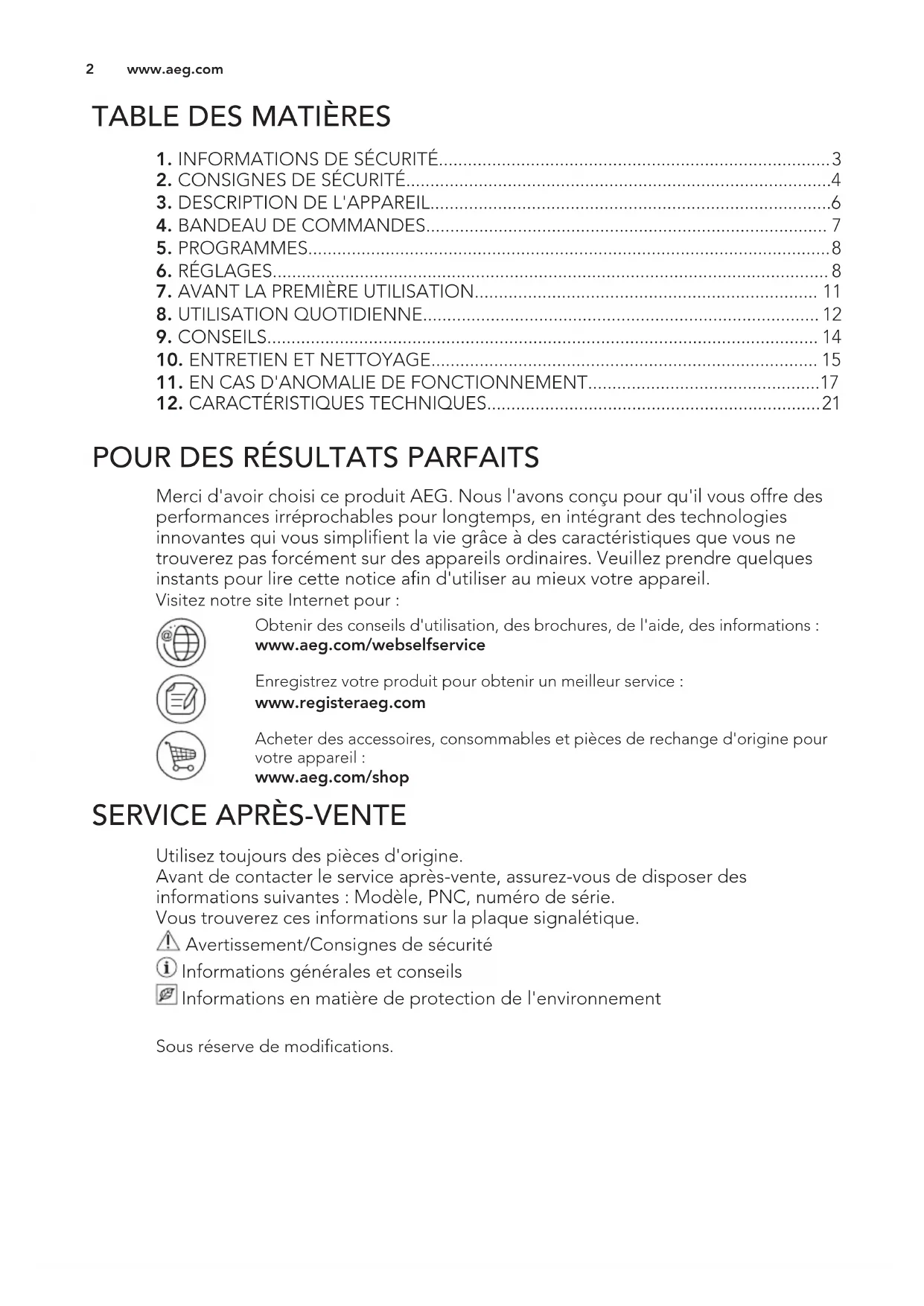 Merci d'avoir choisi ce produit AEG. Nous l'avons conçu pour qu'il vous offre des performances irréprochables pour longtemps, en intégrant des technologies innovantes qui vous simplifient la vie grâce à des caractéristiques que vous ne trouverez pas forcément sur des appareils ordinaires. Veuillez prendre quelques instants pour lire cette notice afin d'utiliser au mieux votre appareil. Visitez notre site Internet pour : Obtenir des conseils d'utilisation, des brochures, de l'aide, des informations : www.aeg.com/webselfservice Enregistrez votre produit pour obtenir un meilleur service : www.registeraeg.com Acheter des accessoires, consommables et pièces de rechange d'origine pour votre appareil : www.aeg.com/shop