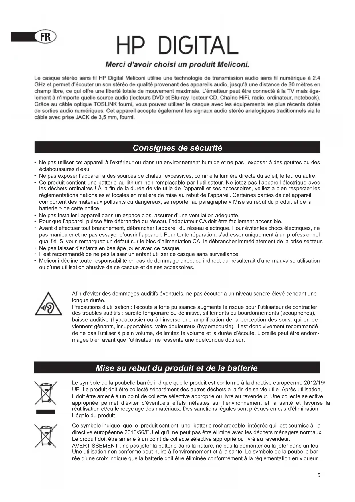 Contenu de l'emballage Installation7 Utilisation Pour une utilisation normale du produit, il suft d’allumer et d’éteindre le casque en appuyant uniquement sur le bouton « A » (appuyer pendant 3 secondes pour l’allumer, appuyer pendant 5 secondes pour l’éteindre). Lorsque le casque n’est pas utilisé, il est conseillé de l’éteindre d’abord pour éviter de décharger complètement la batterie, puis de le positionner correctement sur la base (voir le paragraphe « Recharge de la batterie ») an que cette dernière soit déjà chargée à la prochaine utilisation. S’il n’y a pas d’entrée de signal audio, la base s’éteint automatiquement au bout de 5 minutes (le voyant vert « I » s’éteint). Si le casque n’est pas utilisé pendant une longue période, il est recommandé de débrancher l’adaptateur CA du secteur. Remarques Il est possible de connecter, un autre appareil audio muni d’une entrée numérique optique (par ex. une autre base émettrice ou une barre de son), à la base HP Digital, qui sera alors également connectée « en série », avec le HP Digital, à la source audio principale (par ex. TV). Ceci peut être utile, par exemple, si le téléviseur n’a qu’une seule sortie optique et qu’il faut écouter le signal audio via le HP DIGITAL et en même temps le diffuser vers un autre appareil au choix. Pour s’assurer que le signal audio atteint également l’autre appareil, le connecter à la sortie « Q » (OPTICAL OUT) située sur la base du HP DIGITAL à l’aide d’un deuxième câble audio optique numérique, non fourni, (comme indiqué sur la gure 5). Caractéristiques techniques Mode de transmission Système de saut numérique (Digital Hopping System) Fréquence porteuse 2403MHz – 2478MHz Puissance de sortie RF < 10 mW EIRP Alimentation émetteur DC 5V – 1A Réponse en fréquence 20 Hz – 20 KHz Distorsion < 0.5% Rapport signal/bruit 85 dB Distance de transmission maximale 30 mètres (en champ libre) Temps de chargement du casque environ 1h30 à 2h00 (la premère charge doit durer entre 4h et 5h) Batterie intégrée aux polymères lithium (casque) 3,7 V – 400 mAh Temps de fonctionnement du casque Environ 8 heures avec une batterie entièrement chargée et une utilisation à volume sonore moyen Température de fonctionnement 0°C-40°C Recharge de la batterie Placer le casque (récepteur) sur les contacts de charge de la base (émetteur) pour recharger la batterie interne. Remarque : le casque peut être placé sur la base dans les deux sens. La LED rouge « I » (POWER/CHARGE) s’allume pour conrmer que le casque est correctement positionné sur la base, alors que son extinction indique qu’il est complètement chargé. La première charge doit durer au minimum de 4 à 5 heures.8 Assistance Si vous avez des questions concernant le casque HP DIGITAL : Lire attentivement ce mode d’emploi car il vous permettra de résoudre la plupart des problèmes. Consulter notre site Internet www.meliconi.fr Contacter notre ASSISTANCE TECHNIQUE par courriel à l’adresse hotline@meliconi.fr Déclaration de conformité simpliée UE Le fabricant, Meliconi S.p.A., déclare que le type d’équipement radio, casque HP Digital est conforme à la Directive 2014/53/EU (RED). Le texte intégral de la déclaration de conformité CE est disponible à l’adresse Internet suivante : http://www.meliconi.com/doc/hpdigital. Résolution des problèmes9