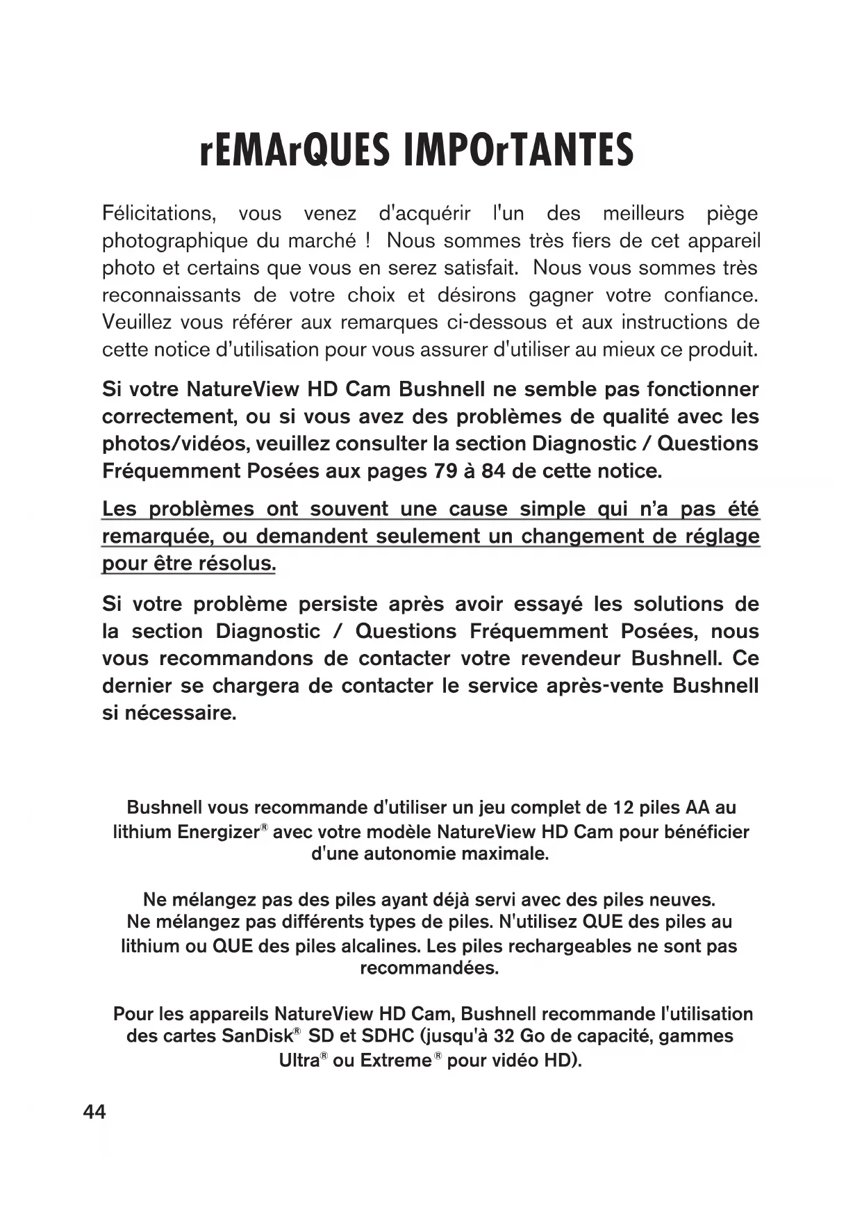 Nos de modèle: 119740 05-15 VIDEO CAM44 rEMArQuES IMPOrTANTES Félicitations, vous venez d'acquérir l'un des meilleurs piège photographique du marché ! Nous sommes très fiers de cet appareil photo et certains que vous en serez satisfait. Nous vous sommes très reconnaissants de votre choix et désirons gagner votre confiance. Veuillez vous référer aux remarques ci-dessous et aux instructions de cette notice d’utilisation pour vous assurer d'utiliser au mieux ce produit. Si votre NatureView HD Cam Bushnell ne semble pas fonctionner correctement, ou si vous avez des problèmes de qualité avec les photos/vidéos, veuillez consulter la section Diagnostic / Questions Fréquemment Posées aux pages 79 à 84 de cette notice. Les problèmes ont souvent une cause simple qui n’a pas été remarquée, ou demandent seulement un changement de réglage pour être résolus. Si votre problème persiste après avoir essayé les solutions de la section Diagnostic / Questions Fréquemment Posées, nous vous recommandons de contacter votre revendeur Bushnell. Ce dernier se chargera de contacter le service après-vente Bushnell si nécessaire. Bushnell vous recommande d'utiliser un jeu complet de 12 piles AA au lithium Energizer