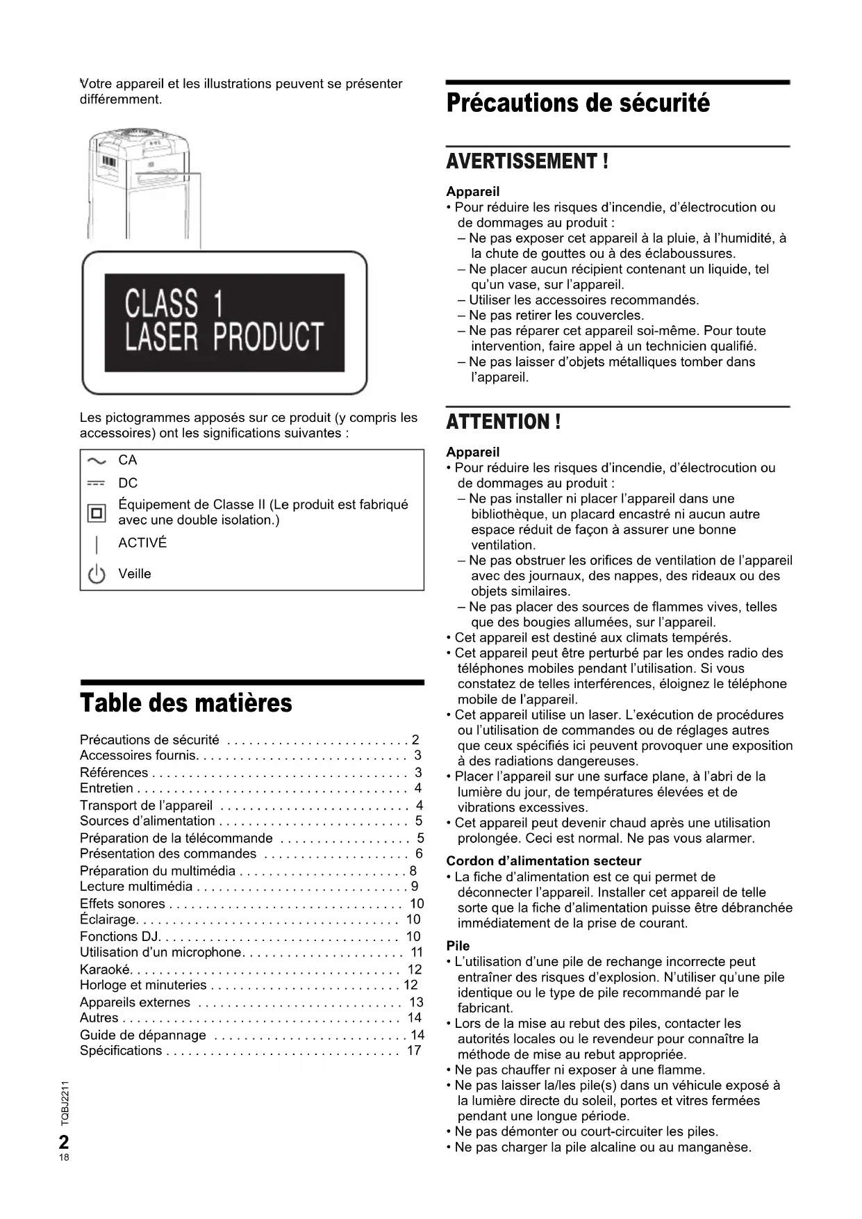 - Spécifications Précautions de sécurité AVERTISSEMENT ! Appareil• Pour réduire les risques d’incendie, d’électrocution ou de dommages au produit :– Ne pas exposer cet appareil à la pluie, à l’humidité, à la chute de gouttes ou à des éclaboussures.– Ne placer aucun récipient contenant un liquide, tel qu’un vase, sur l’appareil.– Utiliser les accessoires recommandés.– Ne pas retirer les couvercles.– Ne pas réparer cet appareil soi-même. Pour toute intervention, faire appel à un technicien qualifié.– Ne pas laisser d’objets métalliques tomber dans l’appareil. ATTENTION ! Appareil• Pour réduire les risques d’incendie, d’électrocution ou de dommages au produit :– Ne pas installer ni placer l’appareil dans une bibliothèque, un placard encastré ni aucun autre espace réduit de façon à assurer une bonne ventilation.– Ne pas obstruer les orifices de ventilation de l’appareil avec des journaux, des nappes, des rideaux ou des objets similaires.– Ne pas placer des sources de flammes vives, telles que des bougies allumées, sur l’appareil.• Cet appareil est destiné aux climats tempérés.• Cet appareil peut être perturbé par les ondes radio des téléphones mobiles pendant l’utilisation. Si vous constatez de telles interférences, éloignez le téléphone mobile de l’appareil.• Cet appareil utilise un laser. L’exécution de procédures ou l’utilisation de commandes ou de réglages autres que ceux spécifiés ici peuvent provoquer une exposition à des radiations dangereuses. • Placer l’appareil sur une surface plane, à l’abri de la lumière du jour, de températures élevées et de vibrations excessives.• Cet appareil peut devenir chaud après une utilisation prolongée. Ceci est normal. Ne pas vous alarmer.Cordon d’alimentation secteur• La fiche d’alimentation est ce qui permet de déconnecter l’appareil. Installer cet appareil de telle sorte que la fiche d’alimentation puisse être débranchée immédiatement de la prise de courant. Pile p. 17