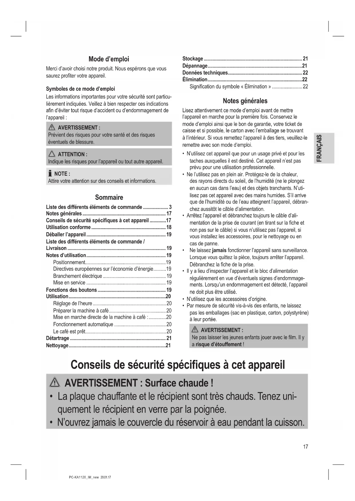 - Utilisez cet appareil uniquement dans un endroit sec et à l’intérieur.19 PC-KA1120_IM_new 20.01.17