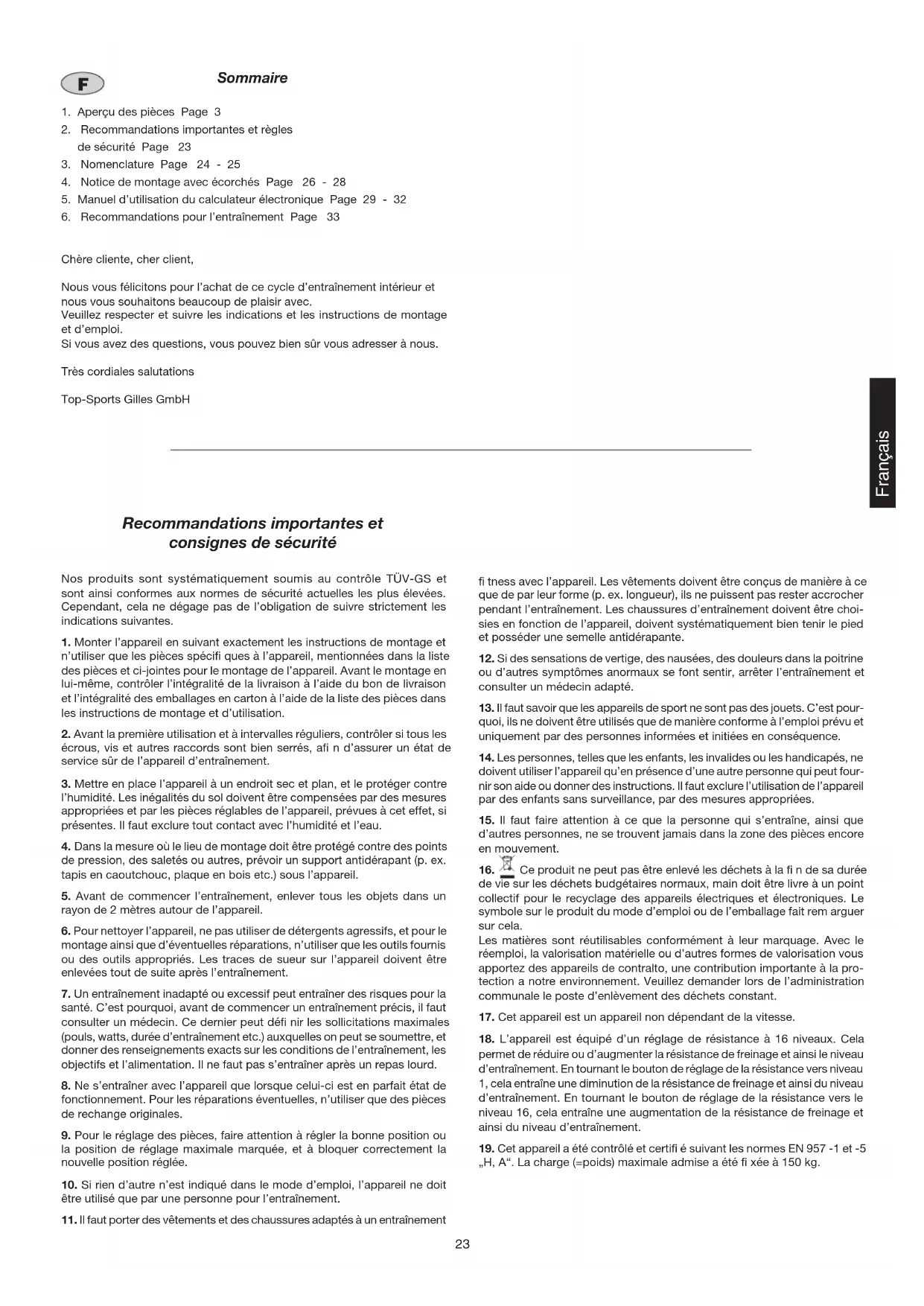 Chère cliente, cher client, Nous vous félicitons pour l’achat de ce cycle d’entraînement intérieur et nous vous souhaitons beaucoup de plaisir avec. Veuillez respecter et suivre les indications et les instructions de montage et d’emploi. Si vous avez des questions, vous pouvez bien sûr vous adresser à nous. Très cordiales salutations Top-Sports Gilles GmbH