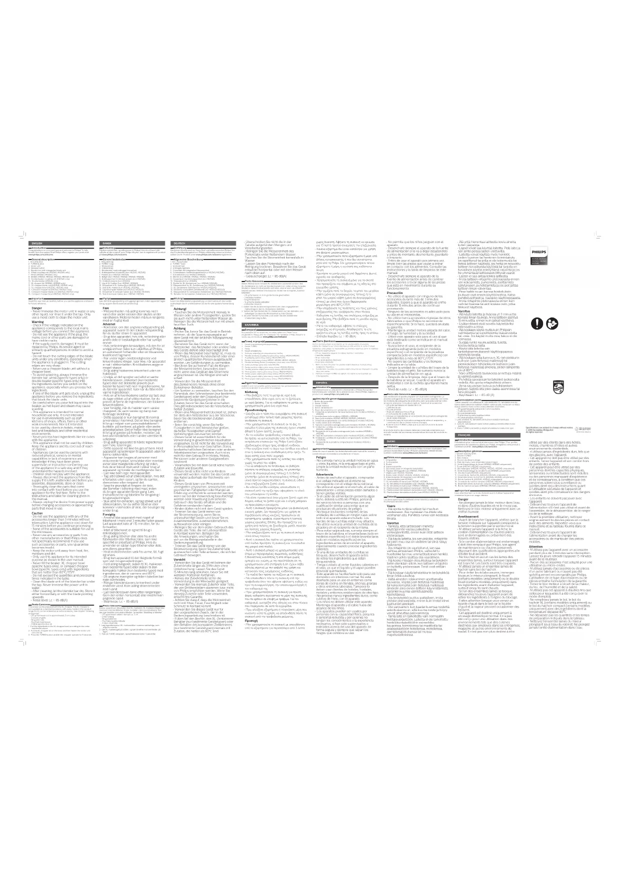 Important Lisez attentivement ce mode d'emploi avant d'utiliser l'appareil et conservez-le pour un usage ultérieur. Danger - Ne plongez jamais le bloc moteur dans l'eau, ni dans d'autres liquides et ne le rincez pas. Nettoyez le bloc moteur uniquement avec un chion humide. Avertissement - Avant de brancher l'appareil, vériez que la tension indiquée sur l'appareil correspond à la tension supportée par le secteur local. - N'utilisez jamais l'appareil si la che, le cordon d'alimentation ou d'autres pièces sont endommagées ou présentent des ssures visibles. - Si le cordon d'alimentation est endommagé, il doit être remplacé par Philips, son agent de maintenance ou d'autres personnes disposant des qualications appropriées an d'éviter tout accident. - Ne touchez en aucun cas les lames des ensembles lames, surtout lorsque l'appareil est branché. Les bords sont très coupants. - N'utilisez jamais un ensemble lames de hachoir sans bol de hachoir. - Pour éviter les éclaboussures, immergez toujours le mixeur plongeant, le fouet (certains modèles uniquement) ou le double fouet (certains modèles uniquement) dans les ingrédients avant d'allumer l'appareil, surtout lorsqu'ils sont chauds. - Si l'un des ensembles lames se bloque, débranchez toujours l'appareil avant de retirer les ingrédients à l'origine du blocage. - Faites attention lorsque vous versez un liquide chaud dans le bol car le liquide chaud et la vapeur peuvent occasionner des brûlures. - Cet appareil est destiné uniquement à un usage domestique normal. Il n'a pas été conçu pour une utilisation dans des environnements tels que des cuisines destinées aux employés dans les entreprises, magasins et autres environnements de travail. Il n'est pas non plus destiné à être utilisé par des clients dans des hôtels, motels, chambres d'hôtes et autres environnements résidentiels. - n'utilisez jamais d'ingrédients durs, tels que des glaçons, avec l'appareil. - Cet appareil ne doit pas être utilisé par des enfants. Tenez l'appareil et son cordon hors de portée des enfants. - Cet appareil peut être utilisé par des personnes dont les capacités physiques, sensorielles ou intellectuelles sont réduites ou des personnes manquant d'expérience et de connaissances, à condition que ces personnes soient sous surveillance ou qu'elles aient reçu des instructions quant à l'utilisation sécurisée de l'appareil et qu'elles aient pris connaissance des dangers encourus. - Les enfants ne doivent pas jouer avec l'appareil. - Débranchez toujours l'appareil de l'alimentation s'il n'est pas utilisé et avant de l'assembler, de le désassembler, de le ranger ou de le nettoyer. - Avant la première utilisation, nettoyez soigneusement toutes les pièces en contact avec des aliments. Reportez-vous aux instructions et au tableau fournis dans ce manuel. - Débranchez toujours l'appareil de l'alimentation avant de changer les accessoires ou de manipuler des pièces mobiles. Attention - N'utilisez pas l'appareil avec un accessoire pendant plus de 3 minutes sans interruption. Laissez toujours refroidir l'appareil 15 minutes avant de le réutiliser. - Aucun des accessoires n'est adapté pour une utilisation au micro-ondes. - N'utilisez jamais d'accessoires ou de pièces d'un autre fabricant ou n'ayant pas été spéciquement recommandés par Philips. L'utilisation de ce type d'accessoires ou de pièces entraîne l'annulation de la garantie. - Tenez le bloc moteur à l'écart de la chaleur, du feu, de l'humidité et de la saleté. - N'utilisez pas cet appareil à d'autres ns que celles pour lesquelles il a été conçu (voir le mode d'emploi). - Ne remplissez jamais le bol, le bol du hachoir XL (certains modèles uniquement) ou le bol du hachoir compact (certains modèles uniquement) avec des ingrédients dont la température dépasse 80°C. - Ne dépassez pas les quantités et les temps de préparation indiqués dans le tableau. - Nettoyez l'ensemble lames du mixeur plongeant sous l'eau du robinet. Ne plongez jamais l'unité d'alimentation dans l'eau. 3000 039 33941 A HR2541, HR2542, HR2543, HR2545 HR2546 Specications are subject to change without notice. © 2019 Koninklijke Philips N.V. All rights reserved.- Après le nettoyage, laissez sécher le mixeur plongeant. Rangez-le horizontalement ou avec la lame orientée vers le haut. - Niveau sonore : Lc = 85 dB(A) Pesto Genovese La préparation de cette recette peut s'eectuer au moyen du hachoir XL. Le hachoir XL n'est pas fourni comme accessoire standard avec tous les modèles de cette gamme de produits, mais il peut être commandé comme accessoire supplémentaire. Reportez-vous au chapitre «Commande d'accessoires». - 275 g de parmesan coupé en cubes d'environ 3 cm - 2 gousses d'ail - 50 g de pignons de pin - 15 g de feuilles de basilic frais - 4 cuillères à soupe d'huile d'olive