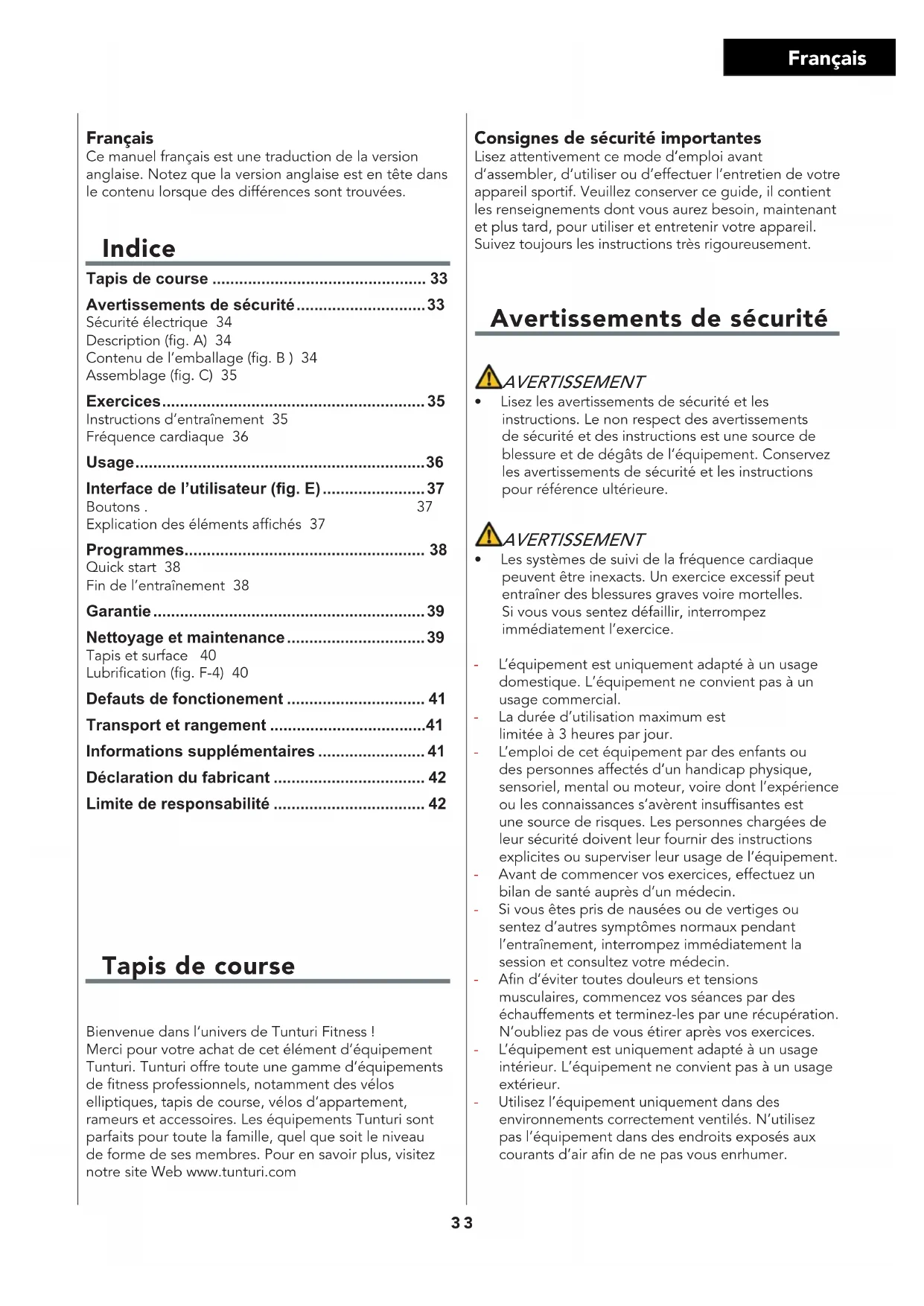 - Vergewissern Sie sich vor dem Zusammenklappen des Geräts, dass die Steigung 0% beträgt. Beträgt die Steigung nicht 0%, wird der Mechanismus beim Zusammenklappen beschädigt.32 Deutsch - Bewegen Sie das Gerät wie angegeben (Abb. F3). Bewegen Sie das Gerät und setzen Sie es vorsichtig ab. Stellen Sie das Gerät auf eine schützende Unterlage, um Schäden am Bodenbelag zu vermeiden. Bewegen Sie das Gerät vorsichtig über unebene Böden. Bewegen Sie das Gerät nicht auf den Rädern Treppen herauf, sondern tragen Sie es an den Handgriffen. - Lagern Sie das Gerät in aufrechter Position (Abb. F1). Lagern Sie das Gerät an einem trockenen Ort mit möglichst wenig Temperaturschwankungen. Zusätzliche Informationen Verpackungsentsorgung Staatliche Vorschriften sagen, dass wir die in Deponien entsorgen Abfallmengen verringern sollen. Daher bitten wir Sie, den gesamten Verpackungsabfall an öffentlichen Recyclingstellen abzugeben Entsorgung am ende der Lebensdauer Wir bei Tunturi hoffen, dass Sie Ihren Fitnesstrainer viele Jahre mit Freude nutzen werden. Jedoch wird irgendwann die Zeit kommen, wenn die Ende der Nutzungsdauer des Fitnesstrainers erreicht ist. Gemäß den europäischen WEEE-Gesetzen sind Sie für eine geeignete Entsorgung des Fitnesstrainers bei einer anerkannten öffentlichen Entsorgungsstelle verantwortlich. Herstellererklärung Tunturi New Fitness BV erklärt hiermit, dass das Produkt folgenden Normen undRichtlinien entspricht: EN 957 (HB), 89/336/EWG. Das Produkt trägt daher das CE-Kennzeichen.05-2018Tunturi New Fitness BVPurmerweg 11311 XE AlmereThe Netherlands Haftungsausschluss © 2018 Tunturi New Fitness BVAlle Rechte vorbehalten.Produkt und Handbuch können geändert werden. Die technischen Daten können ohne Vorankündigung geändert werden.33 Français Français Ce manuel français est une traduction de la version anglaise. Notez que la version anglaise est en tête dans le contenu lorsque des différences sont trouvées. Indice Tapis de course Bienvenue dans l‘univers de Tunturi Fitness !Merci pour votre achat de cet élément d‘équipement Tunturi. Tunturi offre toute une gamme d‘équipements de fitness professionnels, notamment des vélos elliptiques, tapis de course, vélos d‘appartement, rameurs et accessoires. Les équipements Tunturi sont parfaits pour toute la famille, quel que soit le niveau de forme de ses membres. Pour en savoir plus, visitez notre site Web www.tunturi.com Tapis de course ................................................ 33 Avertissements de sécurité ............................. 33 Sécurité électrique 34Description (g. A) 34Contenu de l’emballage (g. B ) 34Assemblage (g. C) 35 Exercices ........................................................... 35 Instructions d’entraînement 35Fréquence cardiaque 36 Usage ................................................................. 36 Interface de l’utilisateur (g. E) ....................... 37 Boutons . 37Explication des éléments afchés 37 Programmes...................................................... 38 Quick start 38Fin de l’entraînement 38 Garantie ............................................................. 39 Nettoyage et maintenance ............................... 39 Tapis et surface 40Lubrication (g. F-4) 40 Defauts de fonctionement ............................... 41 Transport et rangement ...................................41 Informations supplémentaires ........................ 41 Déclaration du fabricant .................................. 42 Limite de responsabilité .................................. 42 Consignes de sécurité importantes Lisez attentivement ce mode d’emploi avant d’assembler, d’utiliser ou d’effectuer l’entretien de votre appareil sportif. Veuillez conserver ce guide, il contient les renseignements dont vous aurez besoin, maintenant et plus tard, pour utiliser et entretenir votre appareil. Suivez toujours les instructions très rigoureusement. Avertissements de sécurité AVERTISSEMENT