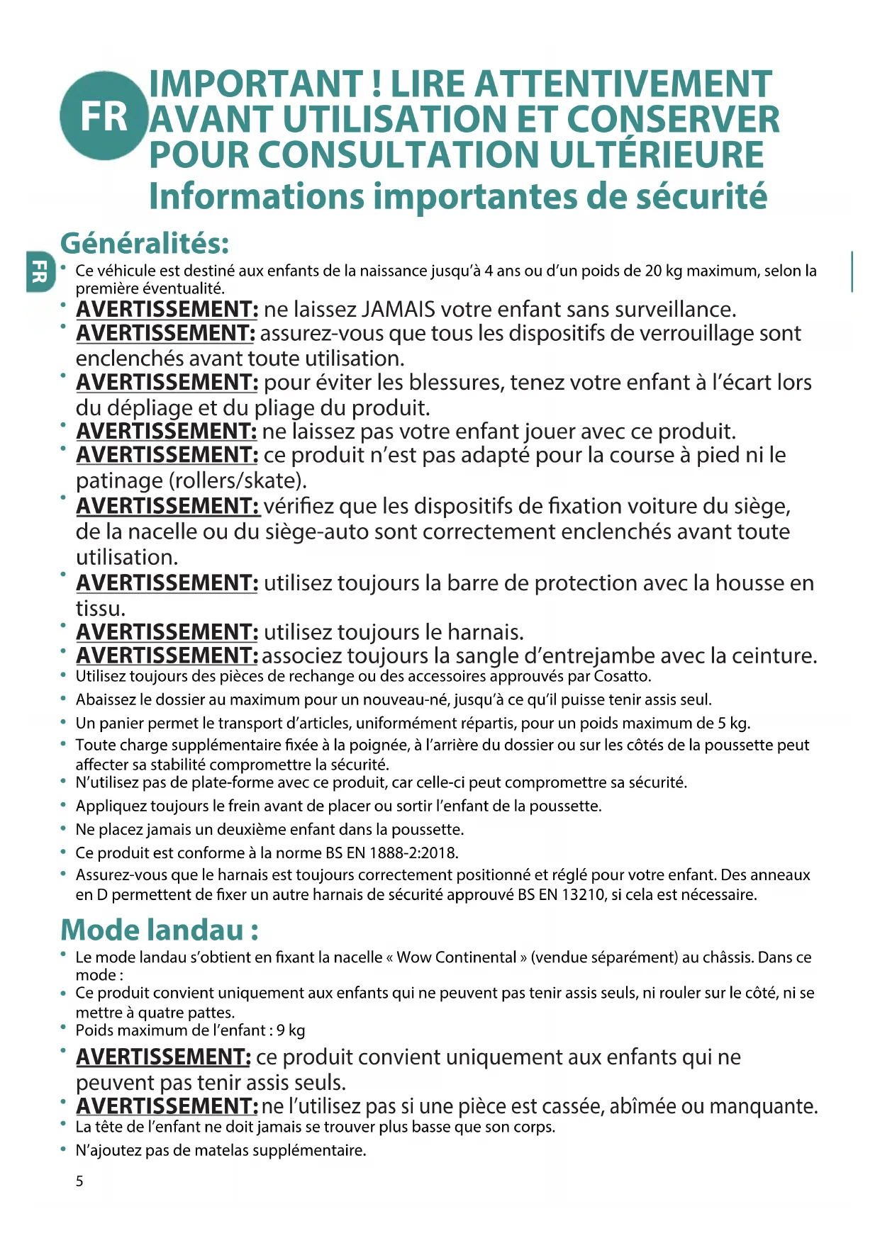 Le mode landau s’obtient en xant la nacelle «Wow Continental» (vendue séparément) au châssis. Dans ce mode: Ce produit convient uniquement aux enfants qui ne peuvent pas tenir assis seuls, ni rouler sur le côté, ni se mettre à quatre pattes. Poids maximum de l’enfant : 9 kg