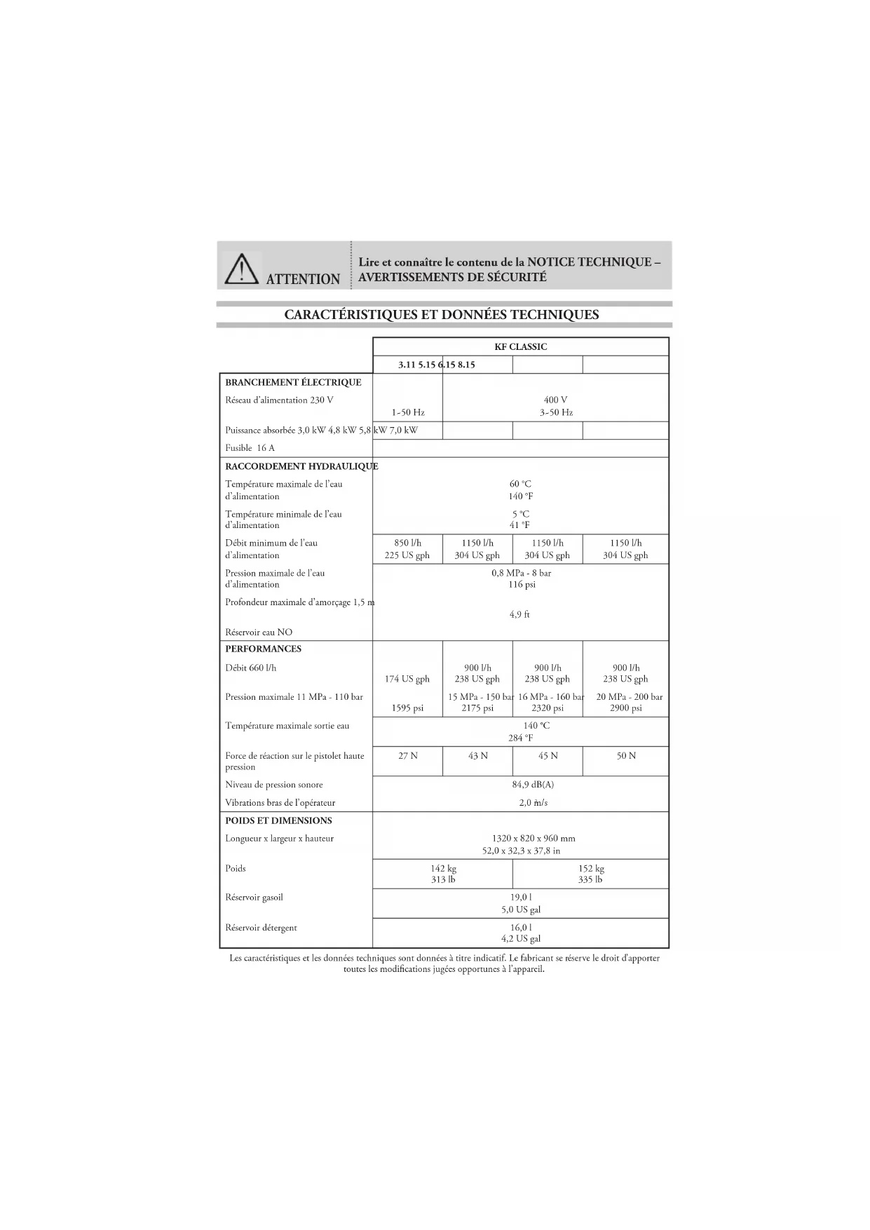BRANCHEMENT ÉLECTRIQUE Réseau d’alimentation 230 V 1~50 Hz 400 V 3~50 Hz Puissance absorbée 3,0 kW 4,8 kW 5,8 kW 7,0 kW Fusible 16 A RACCORDEMENT HYDRAULIQUE Température maximale de l’eau d’alimentation 60 °C 140 °F Température minimale de l’eau d’alimentation 5 °C 41 °F Débit minimum de l’eau d’alimentation 850 l/h 225 US gph 1150 l/h 304 US gph 1150 l/h 304 US gph 1150 l/h 304 US gph Pression maximale de l’eau d’alimentation 0,8 MPa - 8 bar 116 psi Profondeur maximale d’amorçage 1,5 m 4,9 ft Réservoir eau NO PERFORMANCES Débit 660 l/h 174 US gph 900 l/h 238 US gph 900 l/h 238 US gph 900 l/h 238 US gph Pression maximale 11 MPa - 110 bar 1595 psi 15 MPa - 150 bar 2175 psi 16 MPa - 160 bar 2320 psi 20 MPa - 200 bar 2900 psi Température maximale sortie eau 140 °C 284 °F Force de réaction sur le pistolet haute pression 27 N 43 N 45 N 50 N Niveau de pression sonore 84,9 dB(A) Vibrations bras de l’opérateur 2,0 m/s