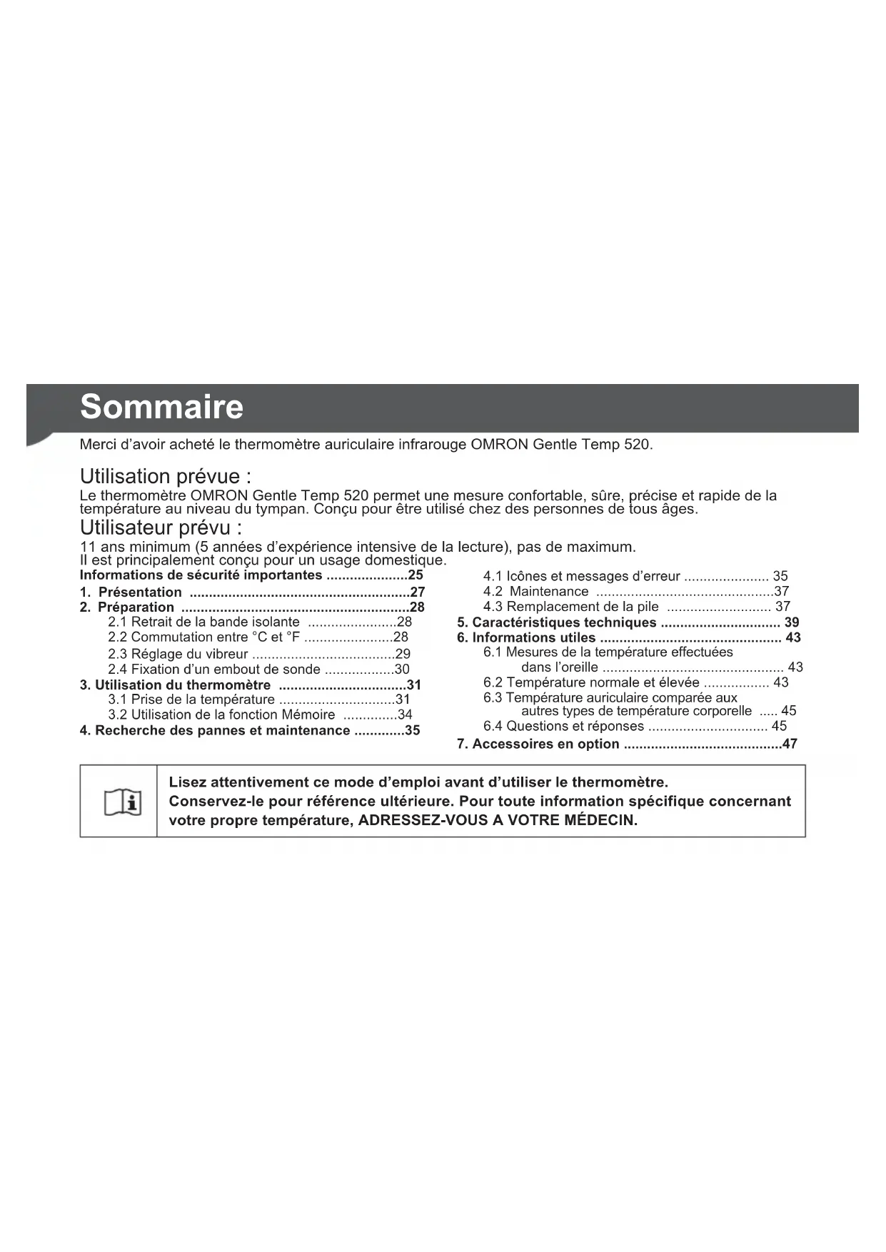520 (MC-520-E) Instruction Manual IM-MC-520-E-04-02/20219042329-5D English Français Deutsch Italiano Español Nederlands Ɋɭɫɫɤɢɣ TürkçeSommaire Merci d’avoir acheté le thermomètre auriculaire infrarouge OMRON Gentle Temp 520. Utilisation prévue : Le thermomètre OMRON Gentle Temp 520 permet une mesure confortable, sûre, précise et rapide de la température au niveau du tympan. Conçu pour être utilisé chez des personnes de tous âges. Utilisateur prévu : 11 ans minimum (5 années d’expérience intensive de la lecture), pas de maximum. Il est principalement conçu pour un usage domestique. Informations de sécurité importantes .....................25