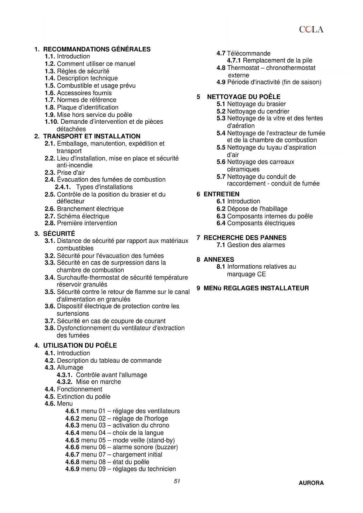 - Lire attentivement ce manuel avant l'installation, l'utilisation et l'entretien du poêle - Pour l’installation, le branchement électrique, la mise à l'essai et l'entretien, vous adresser à un technicien qualifié et/ou agréé. - Raccorder le poêle au conduit de fumée à l'aide d'un terminal qui puisse être inspecté ; le raccordement à plusieurs appareils peut se faire uniquement dans le respect des normes locales et autorisé par l'organisme de contrôle du conduit de fumée. - Raccorder le poêle, de l'extérieur à la bouche d'aspiration, à l'aide d'un tuyau ou d'une prise d’air. - Raccorder le poêle à une prise de courant homologuée de 230 V- 50 Hz. - Vérifier que l’installation électrique et les prises soient en mesure de supporter l’absorption maximum de l’appareil figurant sur l’étiquette et sur le manuel. - Avant de procéder aux opérations d'entretien, débrancher le poêle et attendre qu'il soit froid. - Ne pas utiliser de liquides ou substance inflammables pour allumer le poêle ou raviver la flamme : l'embrasement des granulés se fait automatiquement lorsque le poêle est allumé. - Le poêle doit être alimenté exclusivement par des granulés dont les caractéristiques sont décrites dans ce manuel. - Le poêle à granulés ne doit pas être utilisé comme incinérateur. - Ne jamais obstruer les bouches d'entrée de l'air comburant et de sortie des fumées. - Il est absolument interdit de manipuler des substances facilement inflammables ou explosives à proximité du poêle pendant son fonctionnement. - Ne pas déposer ou modifier la grille de protection du réservoir à granulés et, d'une manière générale, les dispositifs de sécurité. - Éviter le fonctionnement du poêle avec la porte du foyer ouverte et/ou la vitre en mauvais état ou brisée. - Pendant le fonctionnement, la chaleur dégagée par la combustion des granulés surchauffe les surfaces extérieures du poêle telles que la porte du foyer, la poignée et le tuyau d'évacuation des fumées. Éviter donc d'entrer en contact avec ces parties sans porter des protections adéquates. - Toujours tenir à une distance de sécurité suffisante tous les objets sensibles à la chaleur et/ou inflammables. - Nettoyer régulièrement le foyer à chaque allumage ou chargement de granulés. - Faire nettoyer régulièrement le conduit et les déflecteurs de fumée à l’intérieur de la chambre de combustion par un technicien qualifié. - Éviter la formation de fumée ou d'imbrûlés pendant l'allumage et/ou le fonctionnement normal, l’accumulation excessive de granulés imbrûlés dans le brasier doit être retirée manuellement avant tout allumage. - Informer les enfants et les visiteurs des dangers décrits ci-dessus. - En cas d'anomalie de fonctionnement, le poêle peut être rallumé seulement après avoir rétabli la cause de l'inconvénient. - Toute modification ou adaptation non prévue et/ou tout remplacement non autorisé de pièces non originales du poêle peut représenter un danger pour les personnes et dégage le constructeur de toute responsabilité civile et pénale. - N'utiliser que des pièces de rechange d'origine. La société Cola s.r.l. décline toute responsabilité pour les inconvénients, les ruptures ou les accidents causés par l'inobservation ou l'inapplication des indications contenues dans ce manuel.AURORA