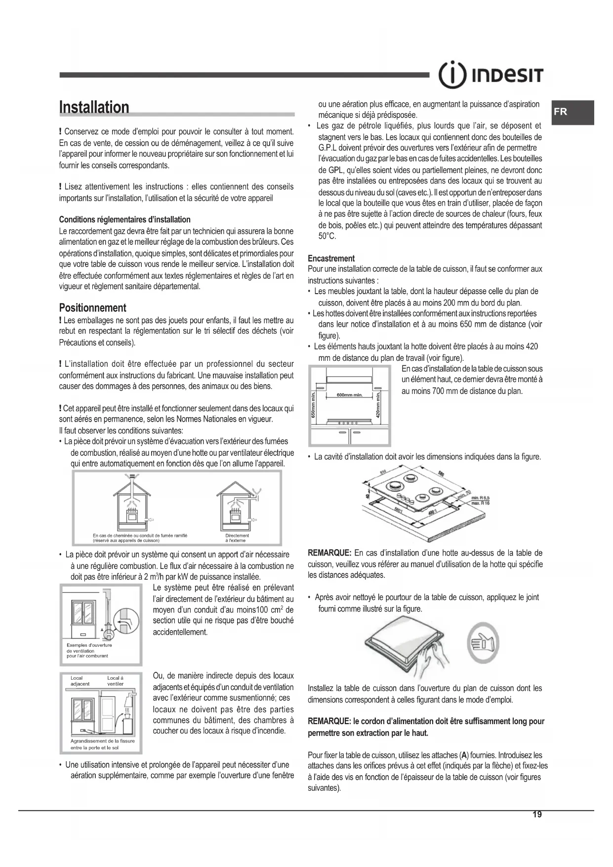 Installation ! Conservez ce mode d’emploi pour pouvoir le consulter à tout moment. En cas de vente, de cession ou de déménagement, veillez à ce qu’il suive l’appareil pour informer le nouveau propriétaire sur son fonctionnement et lui fournir les conseils correspondants. ! Lisez attentivement les instructions : elles contiennent des conseils importants sur l’installation, l’utilisation et la sécurité de votre appareil Conditions réglementaires d’installation Le raccordement gaz devra être fait par un technicien qui assurera la bonne alimentation en gaz et le meilleur réglage de la combustion des brûleurs. Ces opérations d’installation, quoique simples, sont délicates et primordiales pour que votre table de cuisson vous rende le meilleur service. L’installation doit être effectuée conformément aux textes réglementaires et règles de l’art en vigueur et règlement sanitaire départemental. Positionnement ! Les emballages ne sont pas des jouets pour enfants, il faut les mettre au rebut en respectant la réglementation sur le tri sélectif des déchets (voir Précautions et conseils). ! L’installation doit être effectuée par un professionnel du secteur conformément aux instructions du fabricant. Une mauvaise installation peut causer des dommages à des personnes, des animaux ou des biens. ! Cet appareil peut être installé et fonctionner seulement dans des locaux qui sont aérés en permanence, selon les Normes Nationales en vigueur. Il faut observer les conditions suivantes: