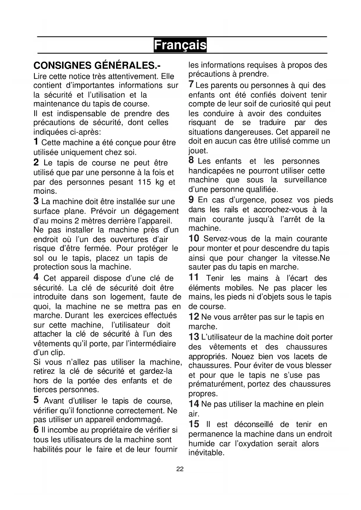 Lire cette notice très attentivement. Elle contient d’importantes informations sur la sécurité et l’utilisation et la maintenance du tapis de course. Il est indispensable de prendre des précautions de sécurité, dont celles indiquées ci-après: