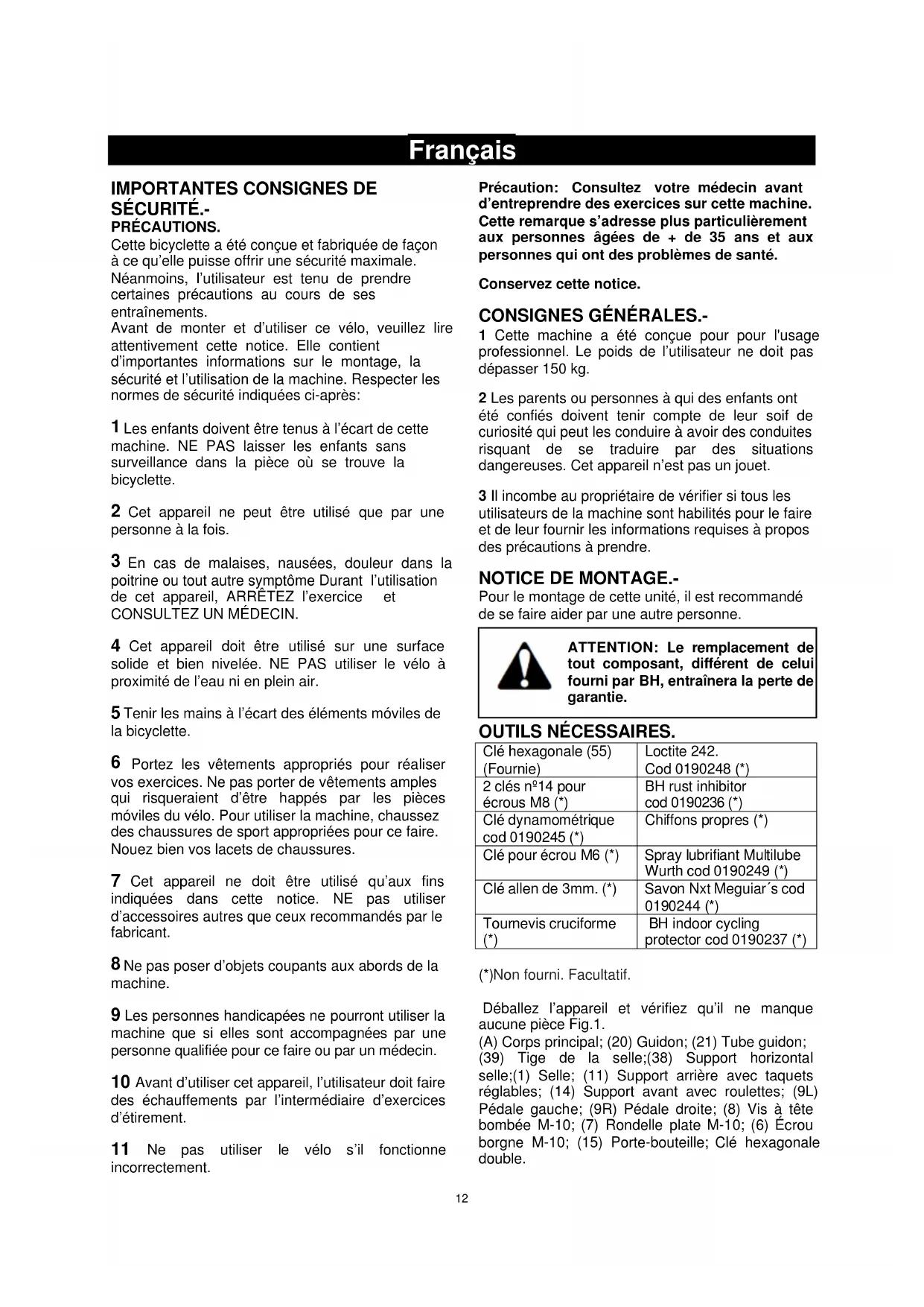 SÉCURITÉ.- PRÉCAUTIONS. Cette bicyclette a été conçue et fabriquée de façon à ce qu’elle puisse offrir une sécurité maximale. Néanmoins, l’utilisateur est tenu de prendre certaines précautions au cours de ses entraînements. Avant de monter et d’utiliser ce vélo, veuillez lire attentivement cette notice. Elle contient d’importantes informations sur le montage, la sécurité et l’utilisation de la machine. Respecter les normes de sécurité indiquées ci-après: