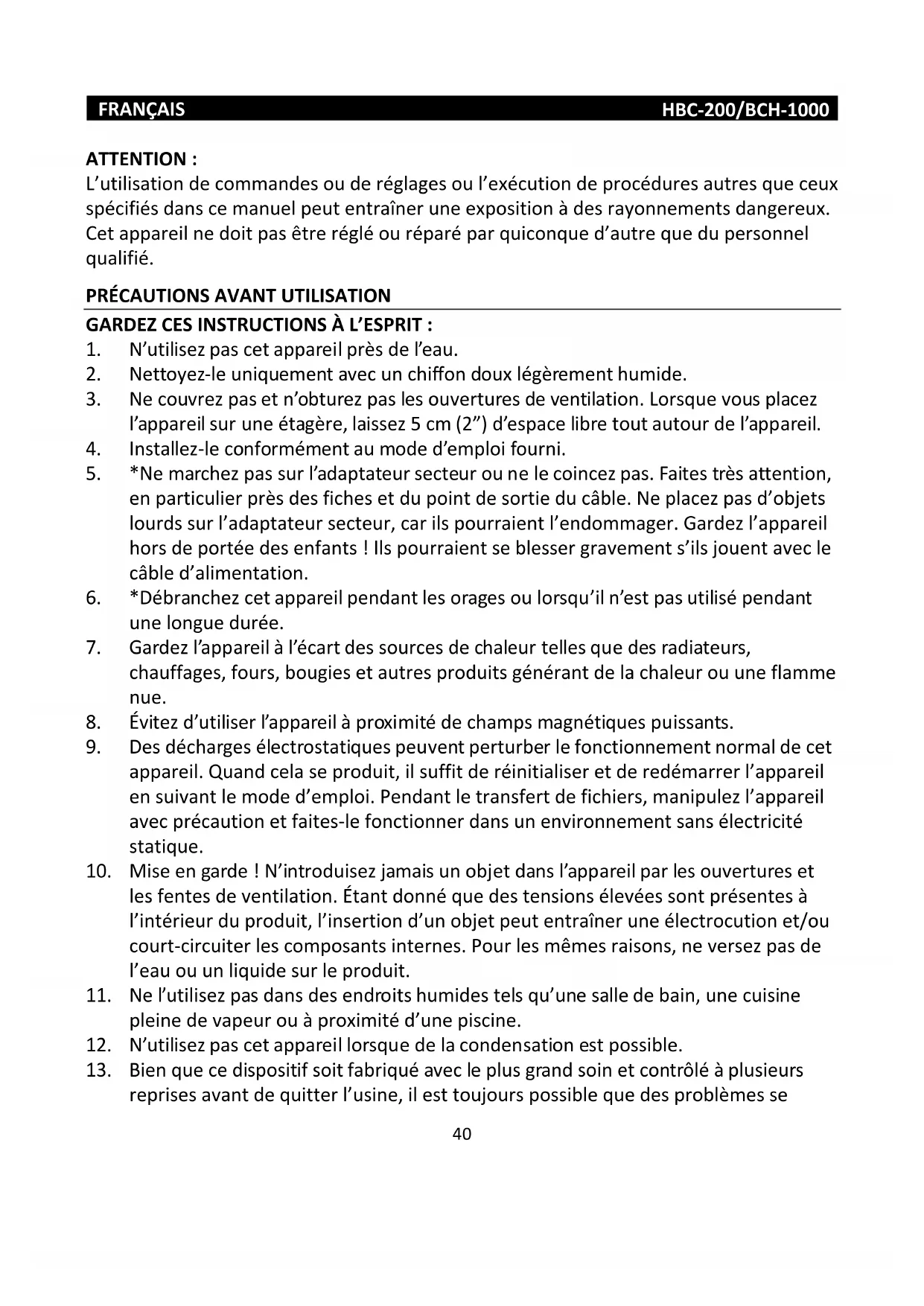 3. Ne plongez pas le casque dans de l’eau ou d’autres liquides. Le HBC-200/BCH-