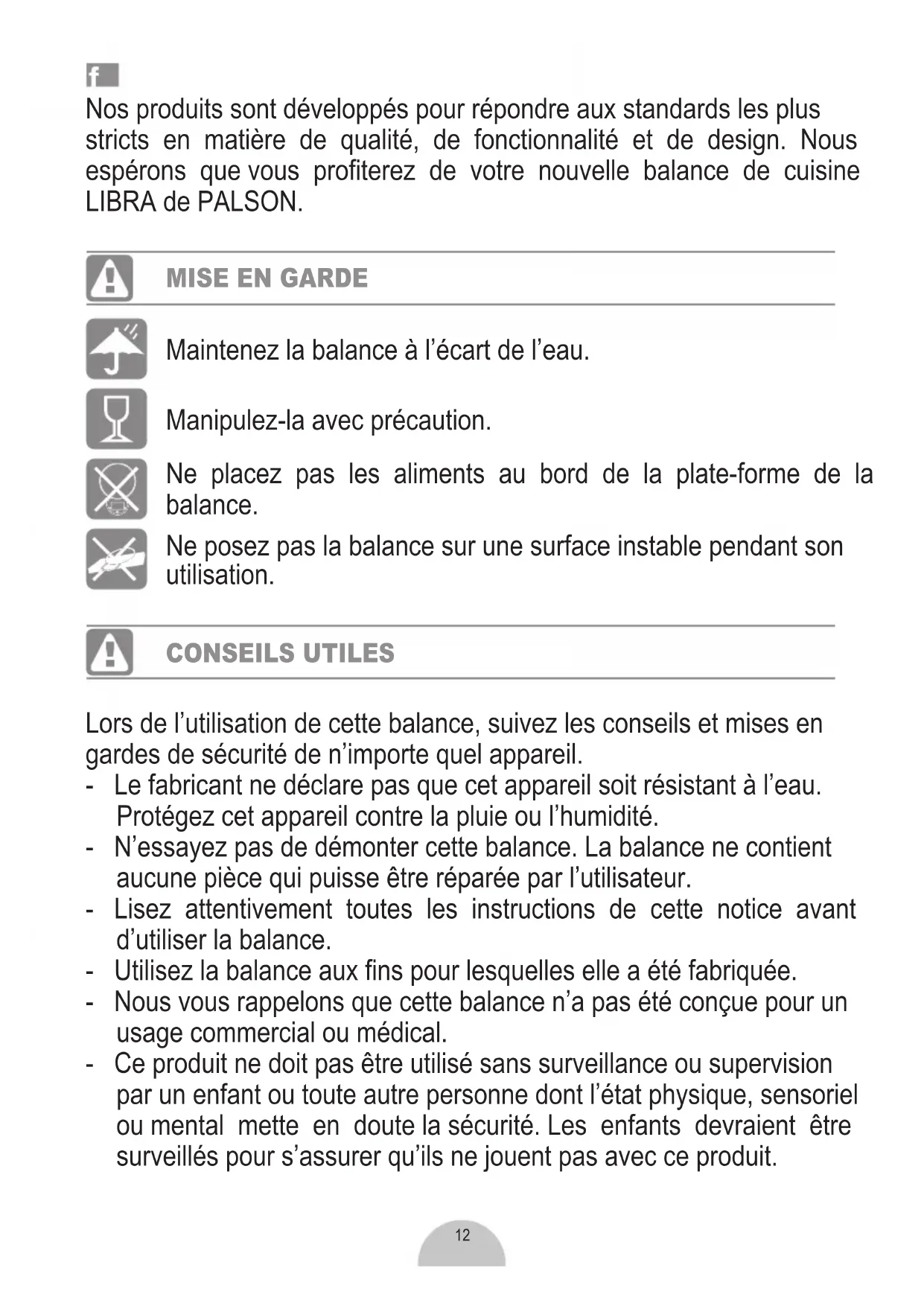 Lors de l'utilisation de cette balance, suivez les conseils et mises en gardes de sécurité de n'importe quel appareil.