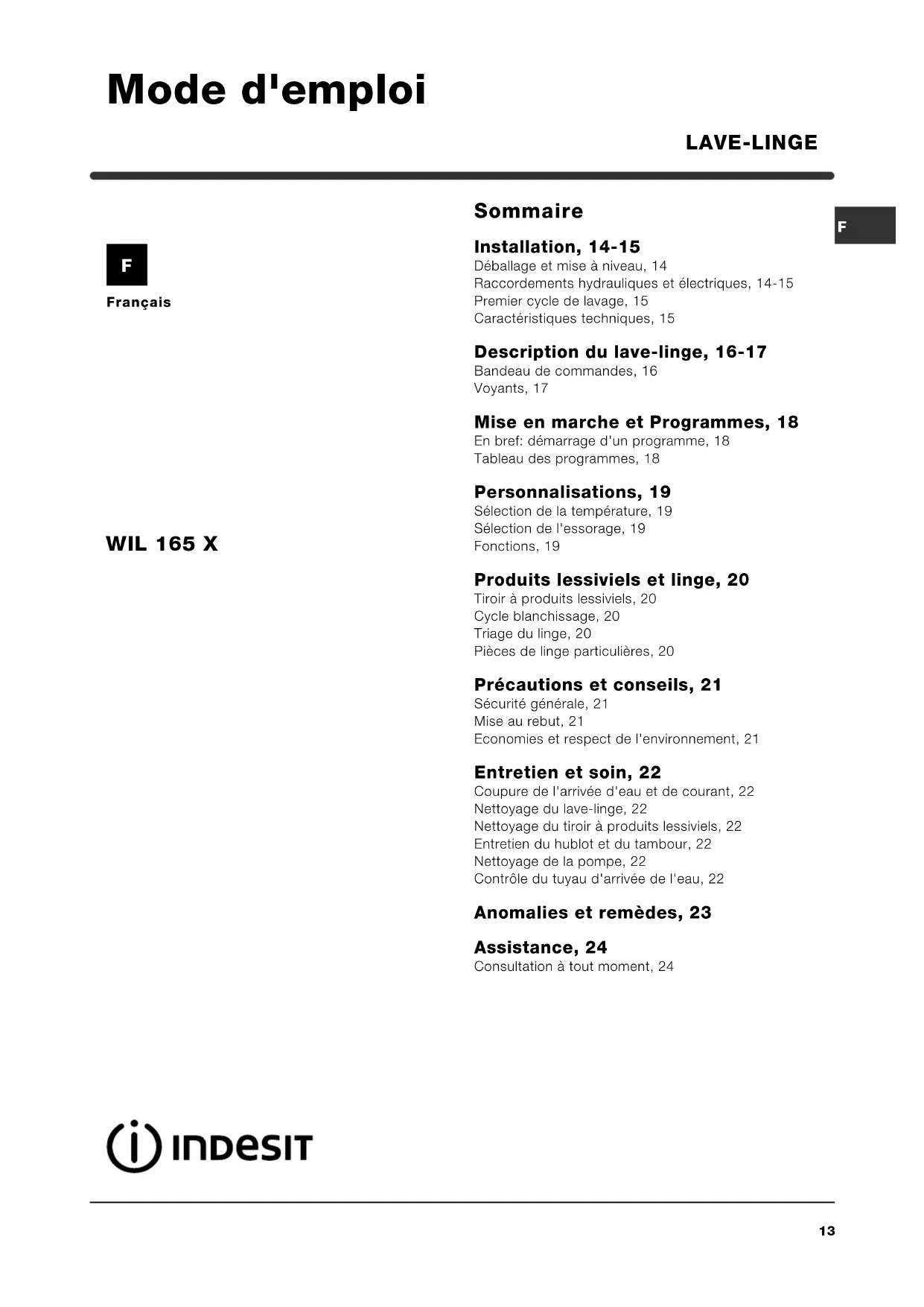 Français Sommaire Installation, 14-15 Déballage et mise à niveau, 14 Raccordements hydrauliques et électriques, 14-15 Premier cycle de lavage, 15 Caractéristiques techniques, 15 Description du lave-linge, 16-17 Bandeau de commandes, 16 Voyants, 17 Mise en marche et Programmes, 18 En bref: démarrage d'un programme, 18 Tableau des programmes, 18 Personnalisations, 19 Sélection de la température, 19 Sélection de l'essorage, 19 Fonctions, 19 Produits lessiviels et linge, 20 Tiroir à produits lessiviels, 20 Cycle blanchissage, 20 Triage du linge, 20 Pièces de linge particulières, 20 Précautions et conseils, 21 Sécurité générale, 21 Mise au rebut, 21 Economies et respect de l'environnement, 21 Entretien et soin, 22 Coupure de l'arrivée d'eau et de courant, 22 Nettoyage du lave-linge, 22 Nettoyage du tiroir à produits lessiviels, 22 Entretien du hublot et du tambour, 22 Nettoyage de la pompe, 22 Contrôle du tuyau d'arrivée de l'eau, 22 Anomalies et remèdes, 23 Assistance, 24 Consultation à tout moment, 24 LAVE-LINGE WIL 165 X Mode d'emploi F14