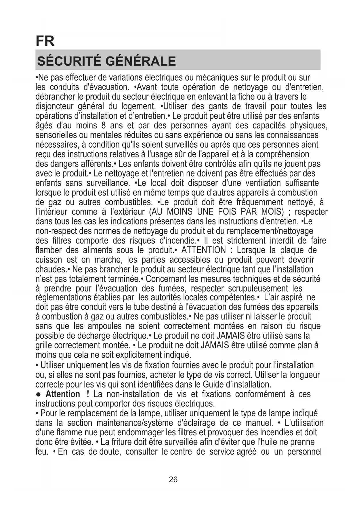 - Ne pas effectuer de variations électriques ou mécaniques sur le produit ou sur les conduits d'évacuation. •Avant toute opération de nettoyage ou d'entretien, débrancher le produit du secteur électrique en enlevant la fiche ou à travers le disjoncteur général du logement. •Utiliser des gants de travail pour toutes les opérations d’installation et d’entretien.• Le produit peut être utilisé par des enfants âgés d’au moins 8 ans et par des personnes ayant des capacités physiques, sensorielles ou mentales réduites ou sans expérience ou sans les connaissances nécessaires, à condition qu'ils soient surveillés ou après que ces personnes aient reçu des instructions relatives à l'usage sûr de l'appareil et à la compréhension des dangers afférents.• Les enfants doivent être contrôlés afin qu'ils ne jouent pas avec le produit.• Le nettoyage et l'entretien ne doivent pas être effectués par des enfants sans surveillance. •Le local doit disposer d'une ventilation suffisante lorsque le produit est utilisé en même temps que d’autres appareils à combustion de gaz ou autres combustibles. •Le produit doit être fréquemment nettoyé, à l’intérieur comme à l’extérieur (AU MOINS UNE FOIS PAR MOIS) ; respecter dans tous les cas les indications présentes dans les instructions d’entretien. •Le non-respect des normes de nettoyage du produit et du remplacement/nettoyage des filtres comporte des risques d'incendie.• Il est strictement interdit de faire flamber des aliments sous le produit.• ATTENTION : Lorsque la plaque de cuisson est en marche, les parties accessibles du produit peuvent devenir chaudes.• Ne pas brancher le produit au secteur électrique tant que l’installation n’est pas totalement terminée.• Concernant les mesures techniques et de sécurité à prendre pour l’évacuation des fumées, respecter scrupuleusement les règlementations établies par les autorités locales compétentes.• L’air aspiré ne doit pas être conduit vers le tube destiné à l'évacuation des fumées des appareils à combustion à gaz ou autres combustibles.• Ne pas utiliser ni laisser le produit sans que les ampoules ne soient correctement montées en raison du risque possible de décharge électrique.• Le produit ne doit JAMAIS être utilisé sans la grille correctement montée. • Le produit ne doit JAMAIS être utilisé comme plan à moins que cela ne soit explicitement indiqué.
