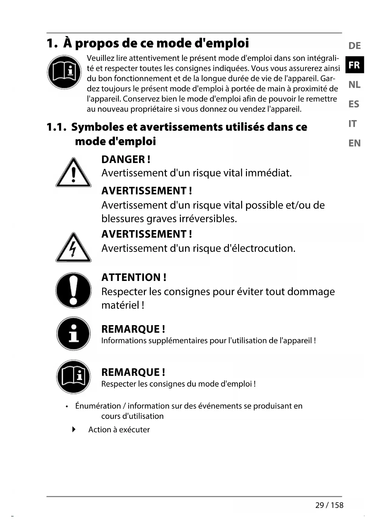 Veuillez lire attentivement le présent mode d'emploi dans son intégrali- té et respecter toutes les consignes indiquées. Vous vous assurerez ainsi du bon fonctionnement et de la longue durée de vie de l'appareil. Gar- dez toujours le présent mode d'emploi à portée de main à proximité de l'appareil. Conservez bien le mode d'emploi afin de pouvoir le remettre au nouveau propriétaire si vous donnez ou vendez l'appareil. 1.1. Symboles et avertissements utilisés dans ce mode d'emploi DANGER ! Avertissement d'un risque vital immédiat. AVERTISSEMENT ! Avertissement d'un risque vital possible et/ou de blessures graves irréversibles. AVERTISSEMENT ! Avertissement d'un risque d'électrocution. ATTENTION! Respecter les consignes pour éviter tout dommage matériel ! REMARQUE ! Informations supplémentaires pour l'utilisation de l'appareil ! REMARQUE ! Respecter les consignes du mode d'emploi !