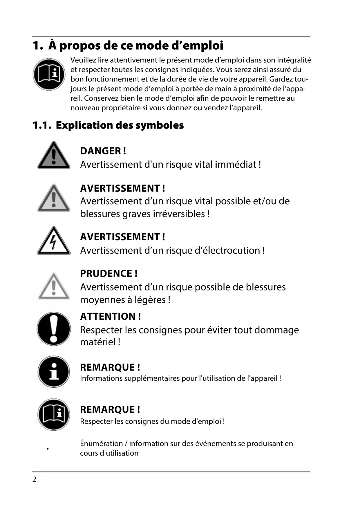 Veuillez lire attentivement le présent mode d’emploi dans son intégralité et respecter toutes les consignes indiquées. Vous serez ainsi assuré du bon fonctionnement et de la durée de vie de votre appareil. Gardez tou- jours le présent mode d’emploi à portée de main à proximité de l’appa- reil. Conservez bien le mode d’emploi afin de pouvoir le remettre au nouveau propriétaire si vous donnez ou vendez l’appareil. 1.1. Explication des symboles DANGER ! Avertissement d'un risque vital immédiat ! AVERTISSEMENT ! Avertissement d’un risque vital possible et/ou de blessures graves irréversibles! AVERTISSEMENT ! Avertissement d’un risque d’électrocution ! PRUDENCE! Avertissement d’un risque possible de blessures moyennes à légères ! ATTENTION! Respecter les consignes pour éviter tout dommage matériel ! REMARQUE! Informations supplémentaires pour l'utilisation de l'appareil ! REMARQUE! Respecter les consignes du mode d'emploi !