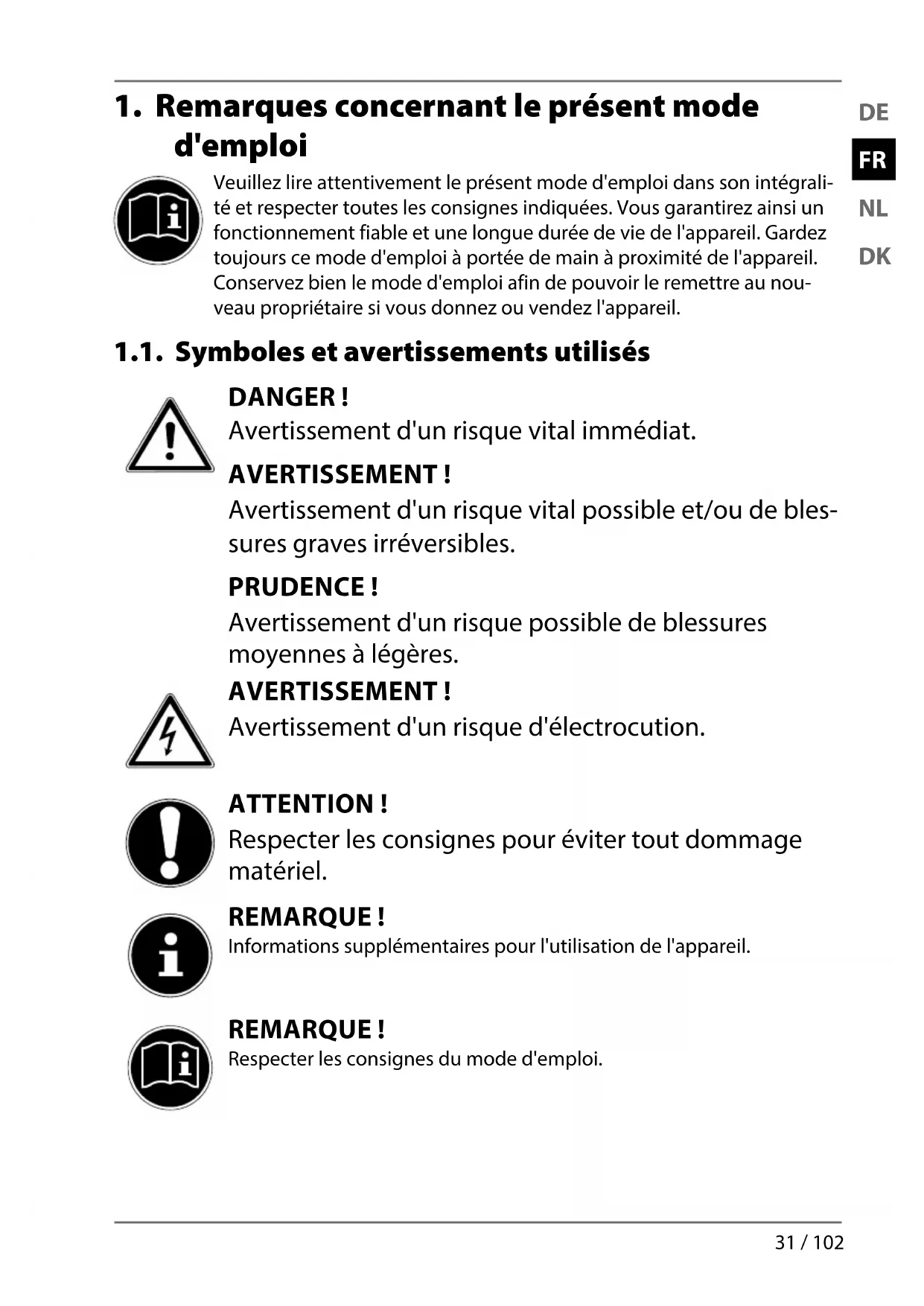 d'emploi Veuillez lire attentivement le présent mode d'emploi dans son intégrali- té et respecter toutes les consignes indiquées. Vous garantirez ainsi un fonctionnement fiable et une longue durée de vie de l'appareil. Gardez toujours ce mode d'emploi à portée de main à proximité de l'appareil. Conservez bien le mode d'emploi afin de pouvoir le remettre au nou- veau propriétaire si vous donnez ou vendez l'appareil. 1.1. Symboles et avertissements utilisés DANGER ! Avertissement d'un risque vital immédiat. AVERTISSEMENT ! Avertissement d'un risque vital possible et/ou de bles- sures graves irréversibles. PRUDENCE ! Avertissement d'un risque possible de blessures moyennes à légères. AVERTISSEMENT ! Avertissement d'un risque d'électrocution. ATTENTION! Respecter les consignes pour éviter tout dommage matériel. REMARQUE ! Informations supplémentaires pour l'utilisation de l'appareil. REMARQUE ! Respecter les consignes du mode d'emploi. 80025 DE-FR-NL-DK eCommerce Content RC1.indb 3180025 DE-FR-NL-DK eCommerce Content RC1.indb 31 29.09.2015 10:01:1429.09.2015 10:01:1432 / 102