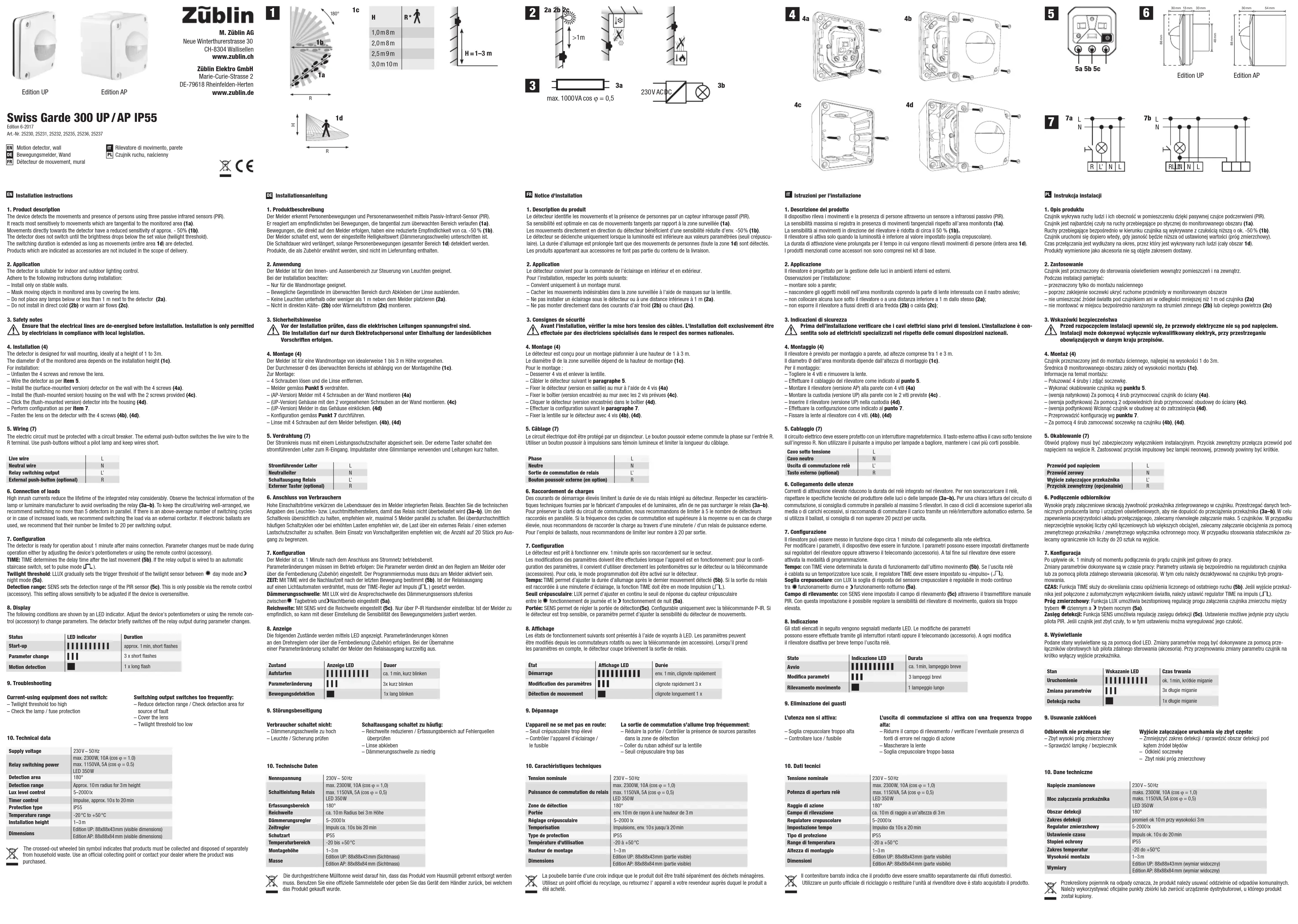 – Twilight threshold too high – Reduce detection range / Check detection area for – Check the lamp / fuse protection source of fault – Cover the lens – Twilight threshold too low10. Technical data Supply voltage 230 V ~ 50 Hz Relay switching power max. 2300 W, 10 A (cos ϕ = 1.0) max. 1150 VA, 5 A (cos ϕ = 0.5) LED 350 W Detection area 180° Detection range Approx. 10 m radius for 3 m height Lux level control 5–2000 lx Timer control Impulse, approx. 10 s to 20 min Protection type IP55 Temperature range -20 °C to +50 °C Installation height 1–3 m Dimensions Edition UP: 88x88x43 mm (visible dimensions) Edition AP: 88x88x84 mm (visible dimensions) The crossed-out wheeled bin symbol indicates that products must be collected and disposed of separately from household waste. Use an official collecting point or contact your dealer where the product was purchased. Notice d'installation1. Description du produitLe détecteur identifie les mouvements et la présence de personnes par un capteur infrarouge passif (PIR). Sa sensibilité est optimale en cas de mouvements tangents par rapport à la zone surveillée (1a). Les mouvements directement en direction du détecteur bénéficient d’une sensibilité réduite d’env. -50 % (1b). Le détecteur se déclenche uniquement lorsque la luminosité est inférieure aux valeurs paramétrées (seuil crépuscu- laire). La durée d’allumage est prolongée tant que des mouvements de personnes (toute la zone1d) sont détectés. Les produits appartenant aux accessoires ne font pas partie du contenu de la livraison.2. ApplicationLe détecteur convient pour la commande de l’éclairage en intérieur et en extérieur.Pour l’installation, respecter les points suivants:– Convient uniquement à un montage mural.– Cacher les mouvements indésirables dans la zone surveillée à l'aide de masques sur la lentille.– Ne pas installer un éclairage sous le détecteur ou à une distance inférieure à 1 m (2a). – Ne pas monter directement dans des courants d’air froid (2b) ou chaud (2c).