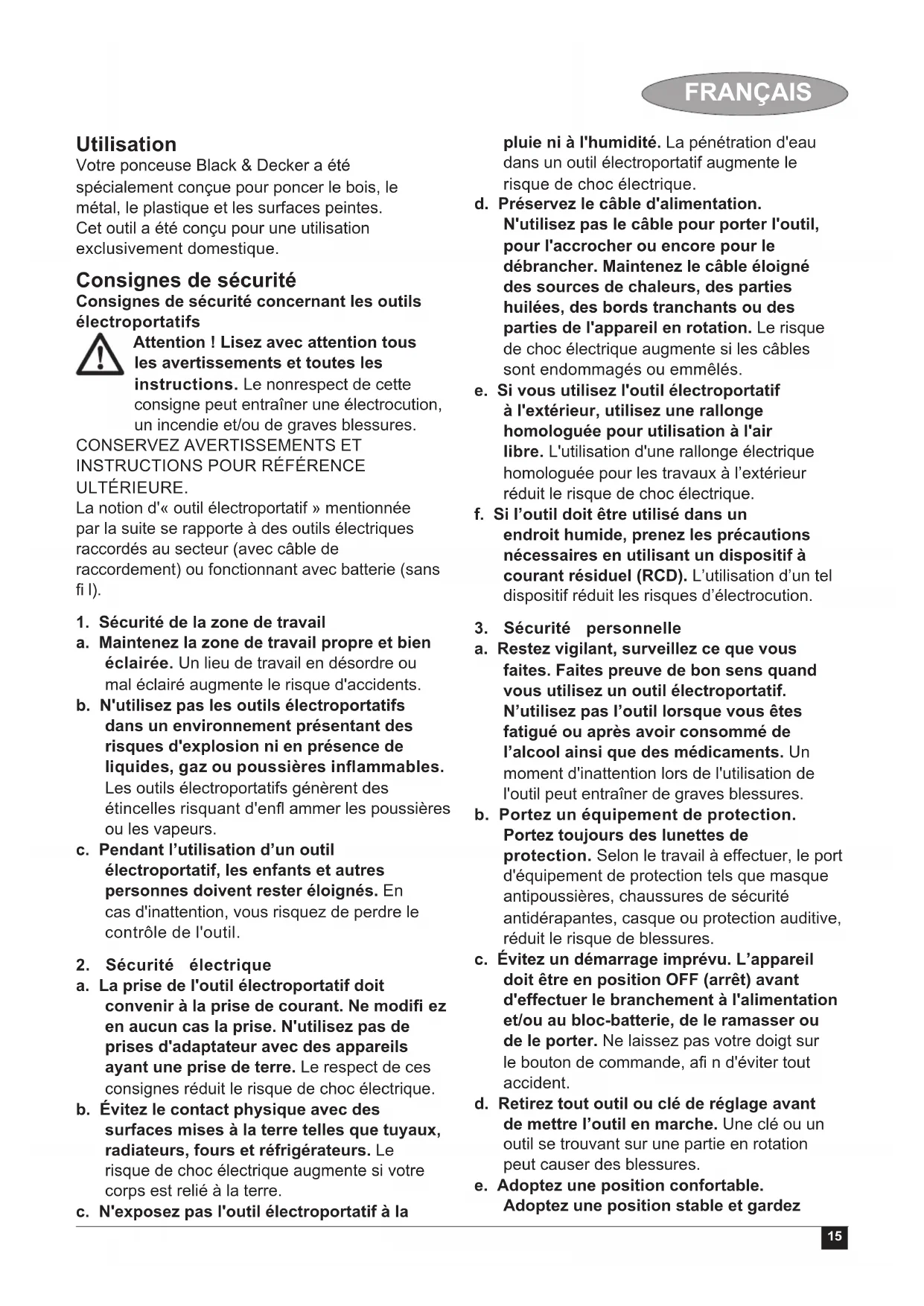 précautions a. Respectez la capacité de l'outil. Utilisez l'outil électroportatif approprié pour le travail à effectuer. Avec un outil approprié, vous travaillerez mieux et en toute sécurité. b. N’utilisez pas un outil électroportatif dont l’interrupteur marche/arrêt est défectueux. Un outil électroportatif qui ne peut plus être mis en marche ou arrêté est dangereux et doit être réparé. c. Retirez la prise de courant et/ou débranchez le blocbatterie avant d'effectuer des réglages, de changer les accessoires ou de ranger l'outil. Cette mesure de précaution empêche de mettre l’outil en marche accidentellement. d. Rangez les outils électroportatifs hors de portée des enfants. Les personnes ne connaissant pas l’outil ou n’ayant pas lu ces instructions ne doivent en aucun cas l’utiliser. Les outils électroportatifs sont dangereux lorsqu'ils sont utilisés par des personnes non initiées. e. Prenez soin des outils électroportatifs. Vérifi ez que les parties en mouvement fonctionnent correctement et qu'elles ne sont pas coincées. Vérifi ez qu'il n’y a pas de pièces cassées ou endommagées susceptibles de nuire au bon fonctionnement de l'outil. S’il est endommagé, faites réparer l’outil avant de l’utiliser. De nombreux accidents sont la conséquence d’outils mal entretenus. f. Maintenez les outils de coupe aiguisés et propres. Des outils soigneusement17 FRANÇAIS