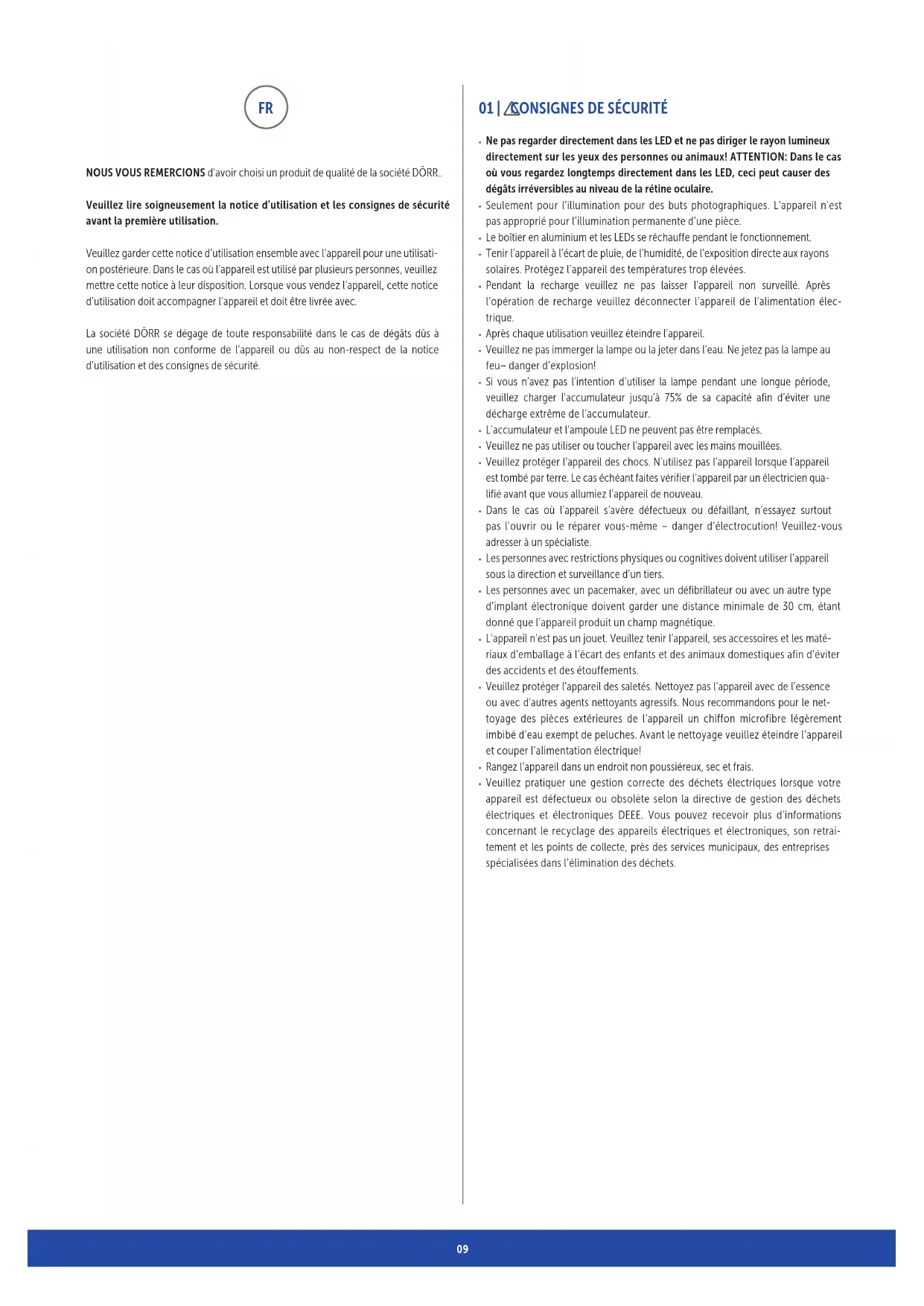 NOUS VOUS REMERCIONS d’avoir choisi un produit de qualité de la société DÖRR.. Veuillez lire soigneusement la notice d'utilisation et les consignes de sécurité avant la première utilisation. Veuillez garder cette notice d’utilisation ensemble avec l’appareil pour une utilisati- on postérieure. Dans le cas où l’appareil est utilisé par plusieurs personnes, veuillez mettre cette notice à leur disposition. Lorsque vous vendez l’appareil, cette notice d’utilisation doit accompagner l’appareil et doit être livrée avec. La société DÖRR se dégage de toute responsabilité dans le cas de dégâts dûs à une utilisation non conforme de l’appareil ou dûs au non-respect de la notice d’utilisation et des consignes de sécurité.