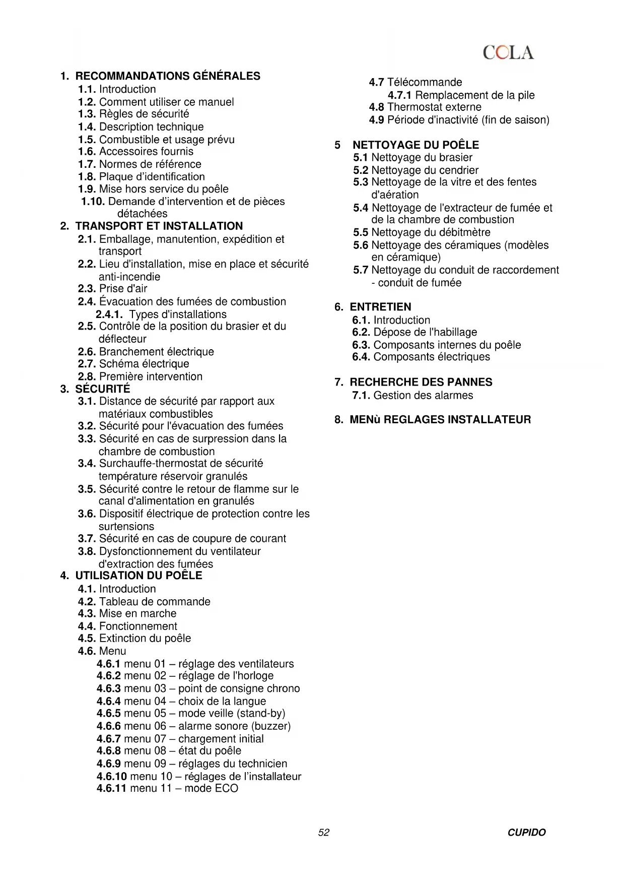 - Lire attentivement ce manuel avant l'installation, l'utilisation et l'entretien du poêle - Pour l’installation, le branchement électrique, la mise à l'essai et l'entretien, vous adresser à un technicien qualifié et/ou agréé. - Raccorder le poêle au conduit de fumée à l'aide d'un terminal qui puisse être inspecté ; le raccordement à plusieurs appareils peut se faire uniquement dans le respect des normes locales et autorisé par l'organisme de contrôle du conduit de fumée. - Raccorder le poêle, de l'extérieur à la bouche d'aspiration, à l'aide d'un tuyau ou d'une prise d’air. - Raccorder le poêle à une prise de courant homologuée de 230 V- 50 Hz. - Vérifier que l’installation électrique et les prises soient en mesure de supporter l’absorption maximum de l’appareil figurant sur l’étiquette et sur le manuel. - Avant de procéder aux opérations d'entretien, débrancher le poêle et attendre qu'il soit froid. - Ne pas utiliser de liquides ou substance inflammables pour allumer le poêle ou raviver la flamme : l'embrasement des granulés se fait automatiquement lorsque le poêle est allumé. - Le poêle doit être alimenté exclusivement par des granulés dont les caractéristiques sont décrites dans ce manuel. - Le poêle à granulés ne doit pas être utilisé comme incinérateur. - Ne jamais obstruer les bouches d'entrée de l'air comburant et de sortie des fumées. - Il est absolument interdit de manipuler des substances facilement inflammables ou explosives à proximité du poêle pendant son fonctionnement. - Ne pas déposer ou modifier la grille de protection du réservoir à granulés et, d'une manière générale, les dispositifs de sécurité. - Éviter le fonctionnement du poêle avec la porte du foyer ouverte et/ou la vitre en mauvais état ou brisée. - Pendant le fonctionnement, la chaleur dégagée par la combustion des granulés surchauffe les surfaces extérieures du poêle telles que la porte du foyer, la poignée et le tuyau d'évacuation des fumées. Éviter donc d'entrer en contact avec ces parties sans porter des protections adéquates. - Toujours tenir à une distance de sécurité suffisante tous les objets sensibles à la chaleur et/ou inflammables. - Nettoyer régulièrement le foyer à chaque allumage ou chargement de granulés. - Faire nettoyer régulièrement le conduit et les déflecteurs de fumée à l’intérieur de la chambre de combustion par un technicien qualifié. - Éviter la formation de fumée ou d'imbrûlés pendant l'allumage et/ou le fonctionnement normal, l’accumulation excessive de granulés imbrûlés dans le brasier doit être retirée manuellement avant tout allumage. - Informer les enfants et les visiteurs des dangers décrits ci-dessus. - En cas d'anomalie de fonctionnement, le poêle peut être rallumé seulement après avoir rétabli la cause de l'inconvénient. - Toute modification ou adaptation non prévue et/ou tout remplacement non autorisé de pièces non originales du poêle peut représenter un danger pour les personnes et dégage le constructeur de toute responsabilité civile et pénale. - N'utiliser que des pièces de rechange d'origine. La société Cola s.r.l. décline toute responsabilité pour les inconvénients, les ruptures ou les accidents causés par l'inobservation ou l'inapplication des indications contenues dans ce manuel.54 CUPIDO