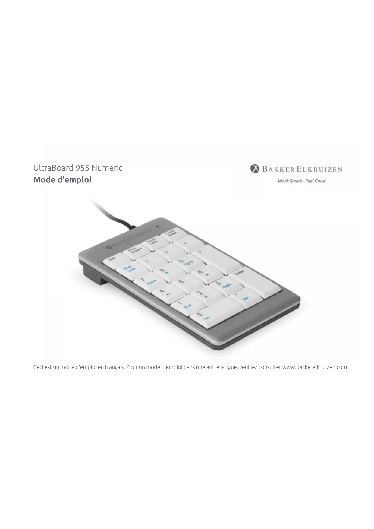 UltraBoard 955 Numeric Mode d’emploi Ceci est un mode d’emploi en français. Pour un mode d’emploi dans une autre langue, veuillez consulter www.bakkerelkhuizen.comLe clavier numérique en bref Nous vous remercions d’avoir acheté l’UltraBoard 955 Numeric. Cet élément numérique complète l’UltraBoard 950. Caractéristiques importantes du clavier numérique :