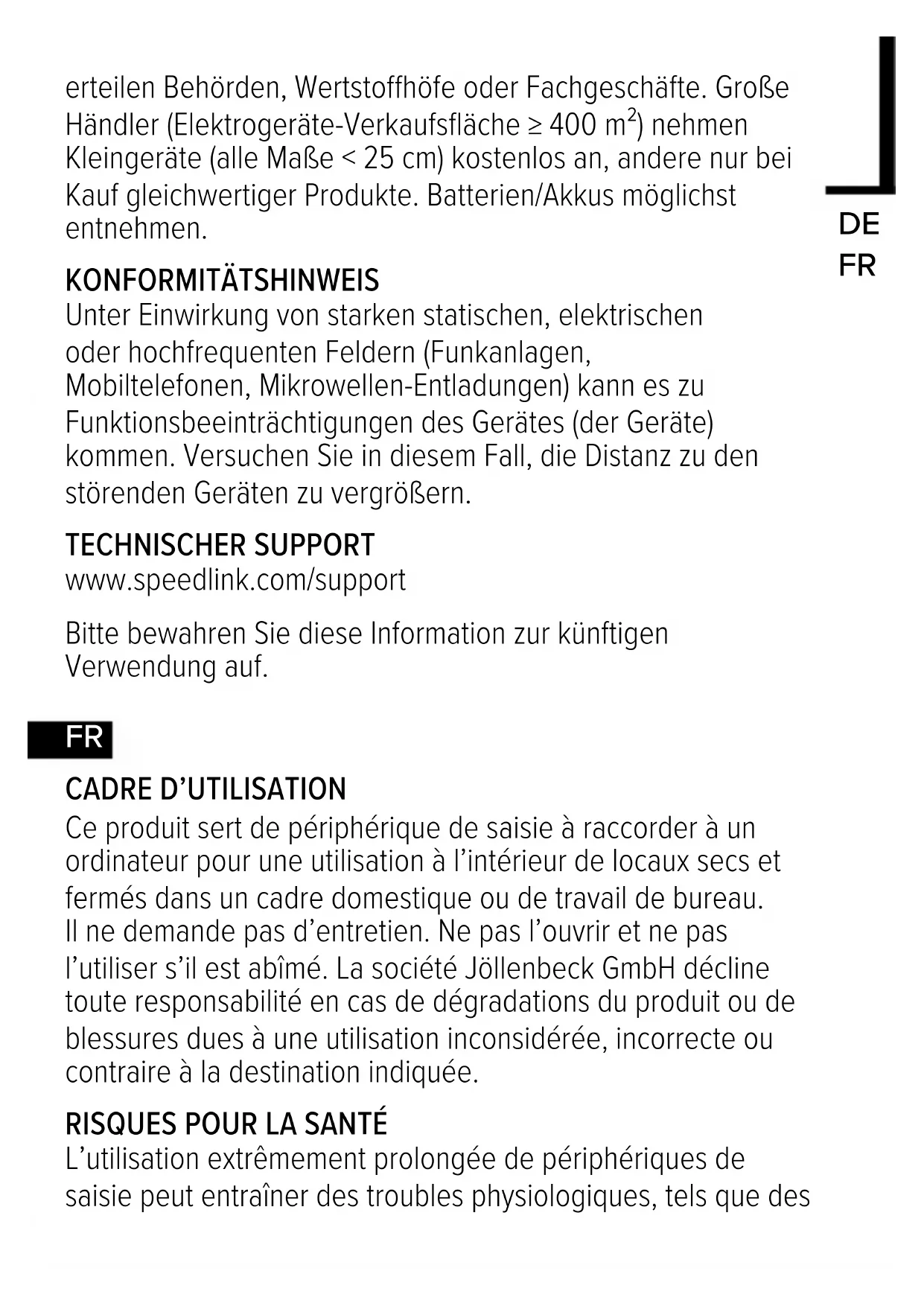 La présence de champs statiques, électriques ou à haute fréquence intenses (installations radio, téléphones mobiles, décharges de micro-ondes) peut perturber le bon fonctionnement de l’appareil (ou des appareils). Dans ce cas, essayez d’éloigner les appareils à l’origine des perturbations. ASSISTANCE TECHNIQUE www.speedlink.com/support Veuillez conserver ces informations afin de pouvoir vous y référer ultérieurement.IT