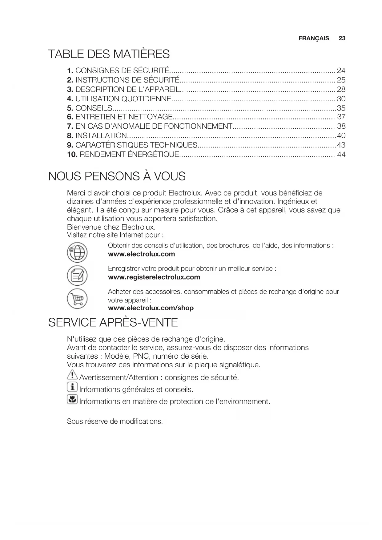 N'utilisez que des pièces de rechange d'origine. Avant de contacter le service, assurez-vous de disposer des informations suivantes : Modèle, PNC, numéro de série. Vous trouverez ces informations sur la plaque signalétique. Avertissement/Attention : consignes de sécurité. Informations générales et conseils. Informations en matière de protection de l'environnement. Sous réserve de modifications. FRANÇAIS