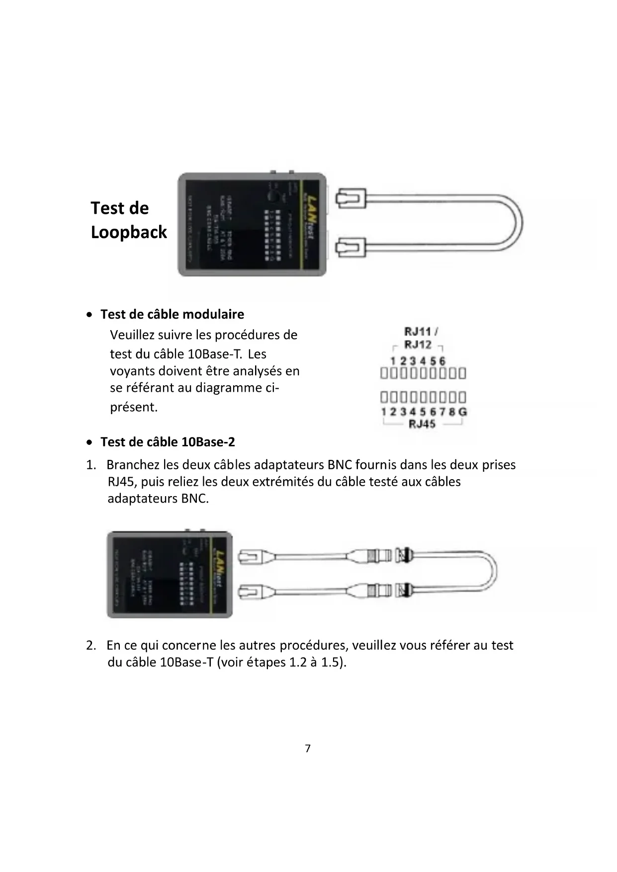 - Test de câble modulaire Veuillez suivre les procédures de test du câble 10Base-T. Les voyants doivent être analysés en se référant au diagramme ci- présent.