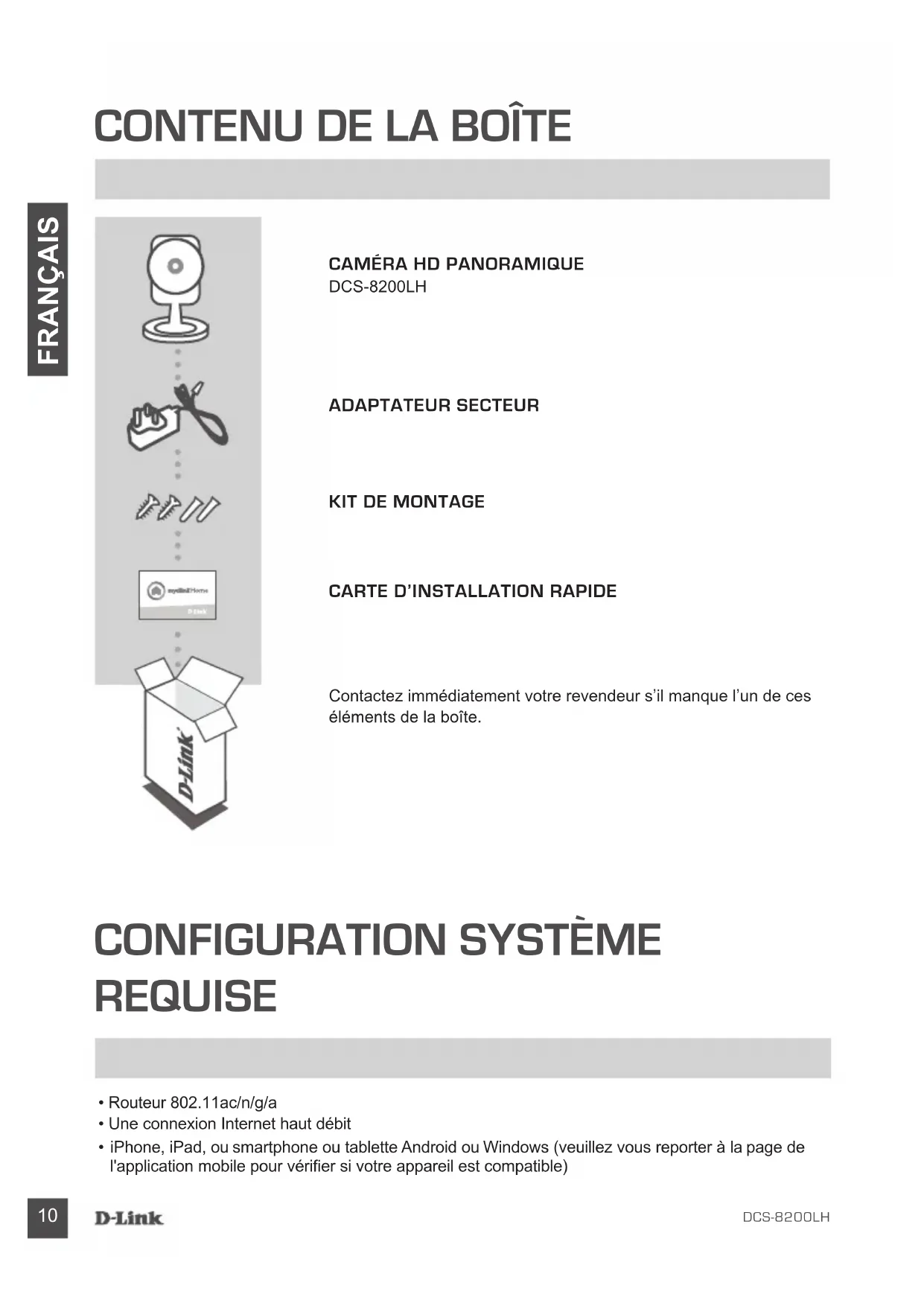 FRANÇAIS Félicitations, votre DCS-8200LH est maintenant prêt à l'emploi ! N'oubliez pas de visiter régulièrement le site Web dlink.com/mydlinkhomehelp pour rechercher les dernières mises à jour du microprogramme an de préserver la sécurité de votre produit et de rester à jour avec les dernières fonctions. Remarque : Si vous rencontrez des problèmes pour enregistrer cette caméra sur votre compte mydlink ou si vous avez acheté une boîte ouverte ou un périphérique de seconde main, effectuez une réinitialisation matérielle en appuyant sur le bouton de réinitialisation du périphérique pendant 10 secondes alors qu'il est sous tension. Si vous devez renvoyer le périphérique au lieu d'achat, veuillez suivre la procédure de réinitialisation matérielle pour effacer toutes les données personnelles du périphérique. Veuillez suivre les instructions ci-dessous pour congurer votre Caméra HD panoramique.